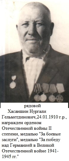 Хасаншин Нургали Гельметдинович родился в 1910 году в селе Карамалы Спасского уезда Казанской губернии (ныне Алькеевского р-на РТ). Участник Великой Отечественной войны. Призван на фронт 1942 году. Умер в 1987 году.