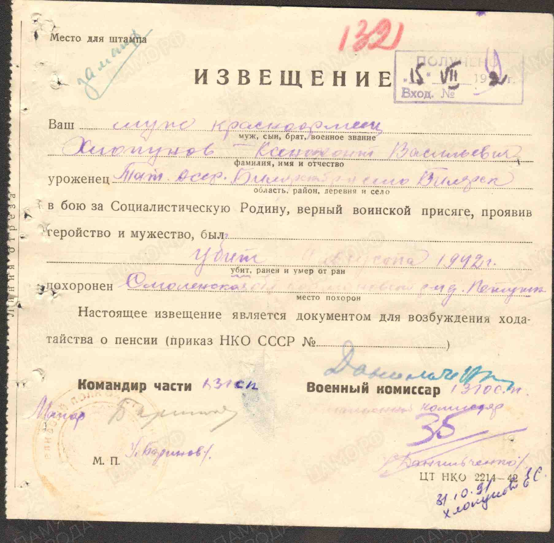 ХЛОПУНОВ Ксенофонт Васильевич, 1906, с. Билярск. До призыва в армию работал в к-зе Им. Куйбышева. Мобилизован Билярским РВК 29 дек. 1941. Воевал на Западном фронте в составе 50 А/ 5 А. Красноармеец, пулемётчик 1156 СП 344 СД/ 1310 СП 19 СД. В июне 1942 проходил через 206 запасной СП. Погиб 9 авг. 1942, д. Петушки, Гжатский р-н, Смоленская обл. Увековечен на братском воинском захоронении в д. Самуйлово, Гагаринский р-н.
