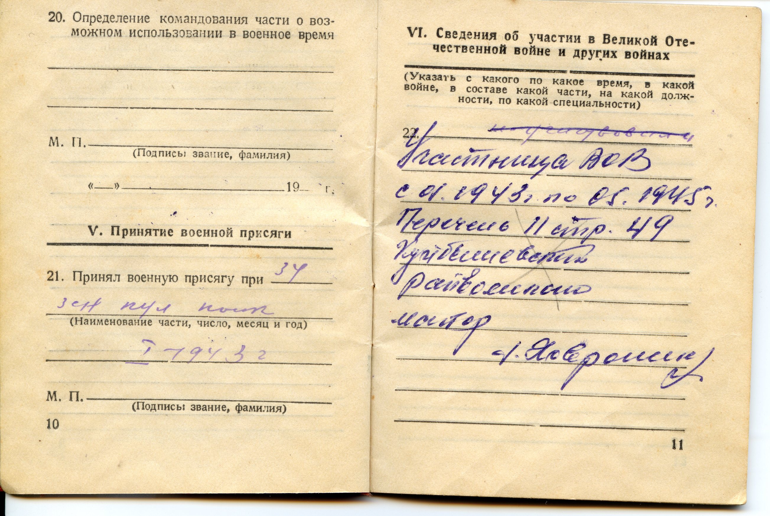 Участница Великой Отечественной войны. Призвана по мобилизации 5 января 1943 года Алатырским РВК ЧувАССР. Проходила службу пулеметчицей в 34 зенитно-пулеметном полку. Данный полк обеспечивал сопровождение судов по реке Волга. Демобилизовалась по окончанию войны в июле 1945 года.