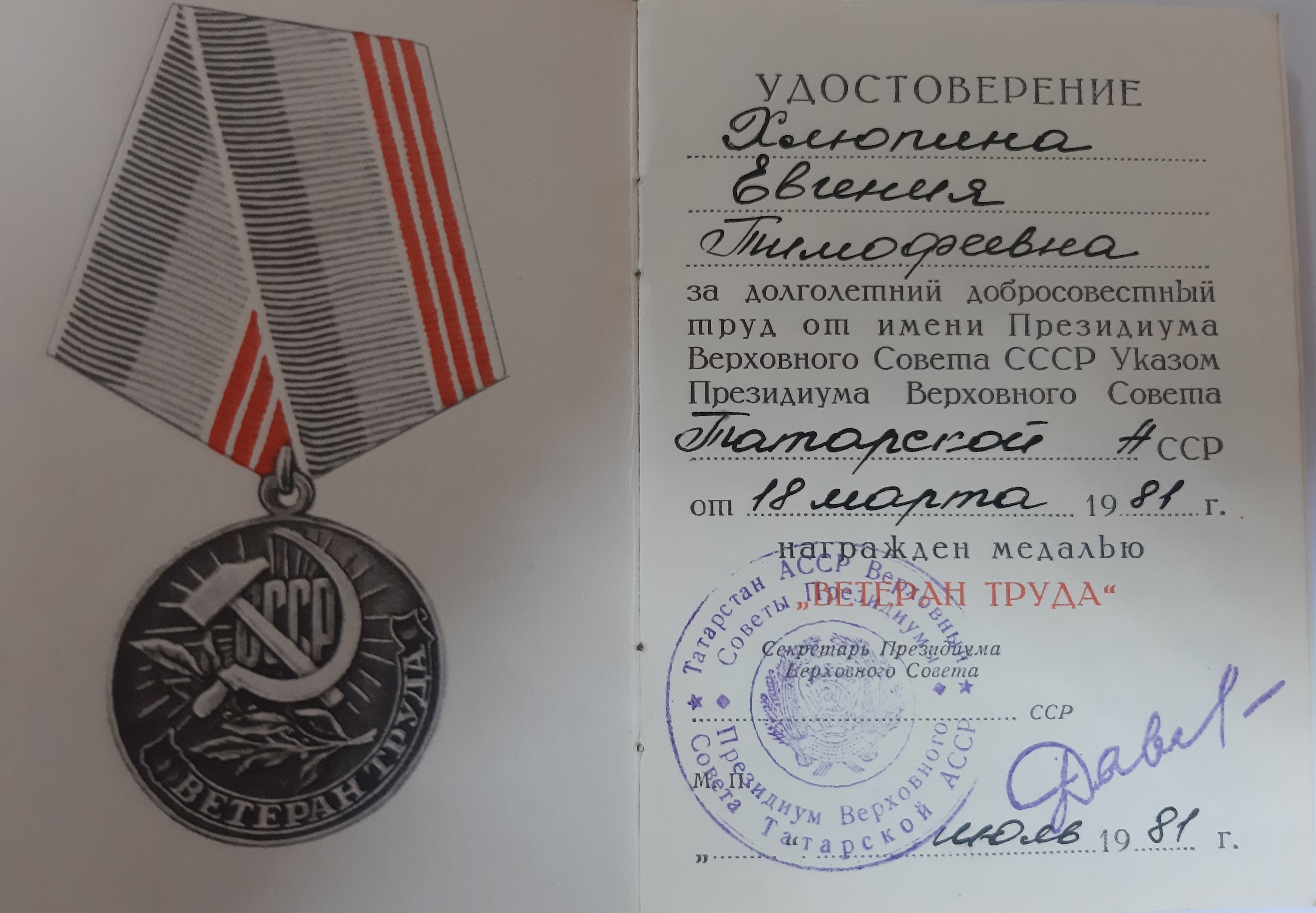 На заслуженный отдых Е.Хлюпина вышла в 1983 году. Ветеран тыла и труда.