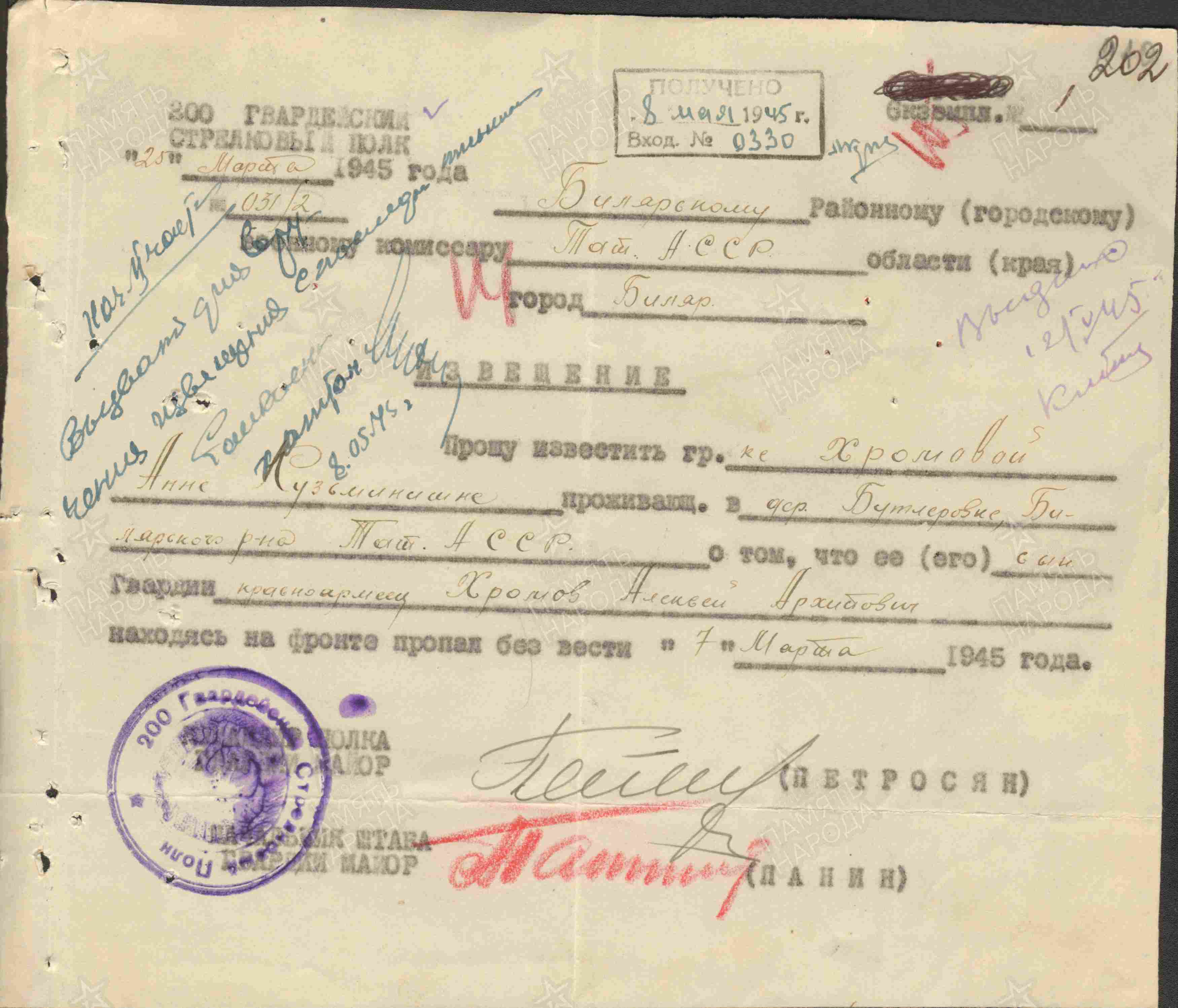 ХРАМОВ Алексей Архипович, 1924, д. Бутлеровка (имение). Мобилизован Ленинским РВК г. Казань 20 авг. 1942. Красноармеец. Воевал в составе 758 СП 88 СД 31 А ЗападФ, 742 СП 164 СД 69/65 СК 33 А Зап. фронта. Ошибочно учтён погибшим 4 фев. 1944 у д. Букштыны, Витебская обл., БССР. Был ранен и находился на излечении в ЭГ 2884, г. Реутов, Московская обл. В 1945 – гв. красноармеец, 200 гв. СП 68 гв. СД 30 СК 26 А 3 УкрФ. Пропал без вести 7 марта 1945 в р-не оз. Балатон, Венгрия.