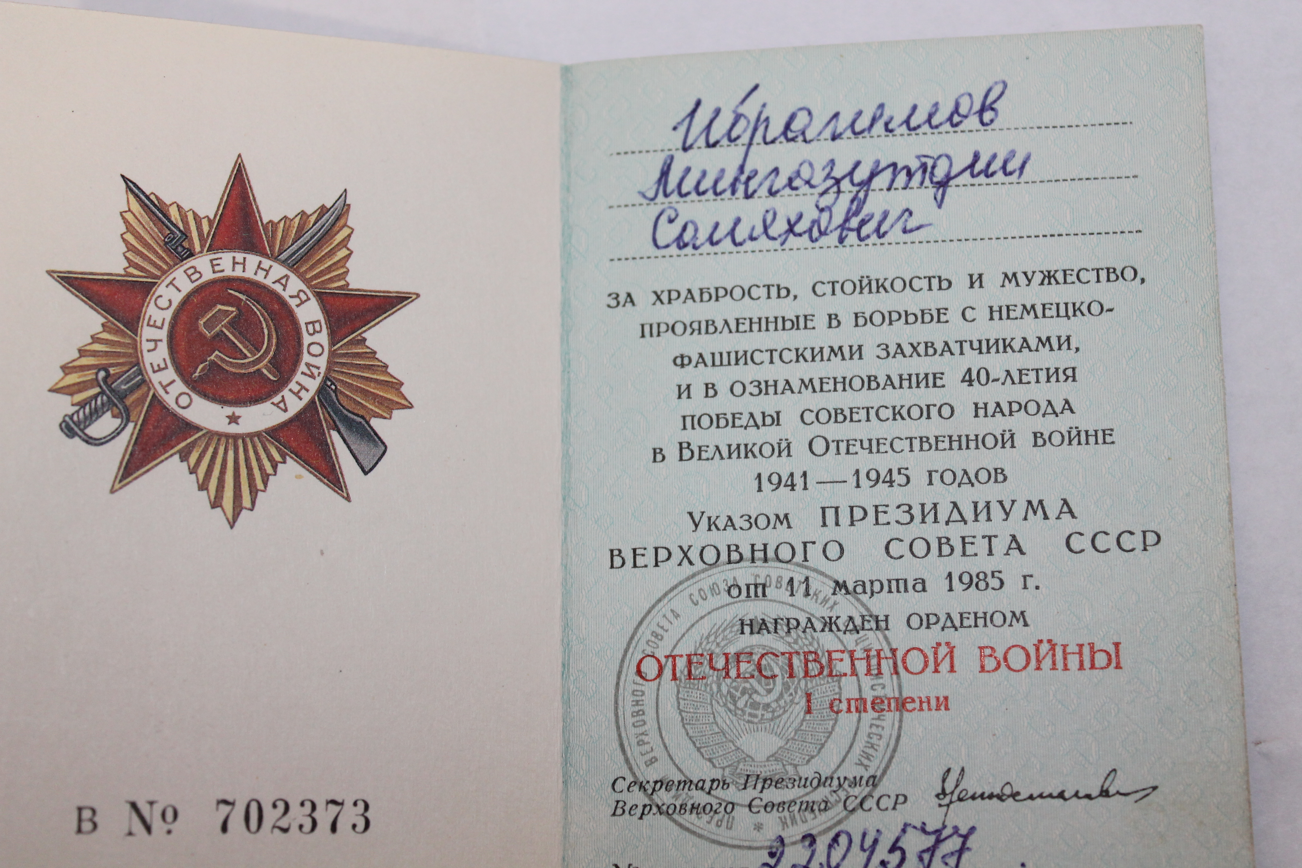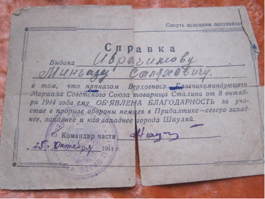 За боевые заслуги М.Ибрагимов награжден орденом Отечественной войны, медалями Жукова и «За победу над Германией». Среди документов бережно хранится Благодарность Сталина от 8 октября 1944 года за героизм и отвагу, проявленные во время прорыва обороны немцев в Прибалтике в районе города Шауляй.