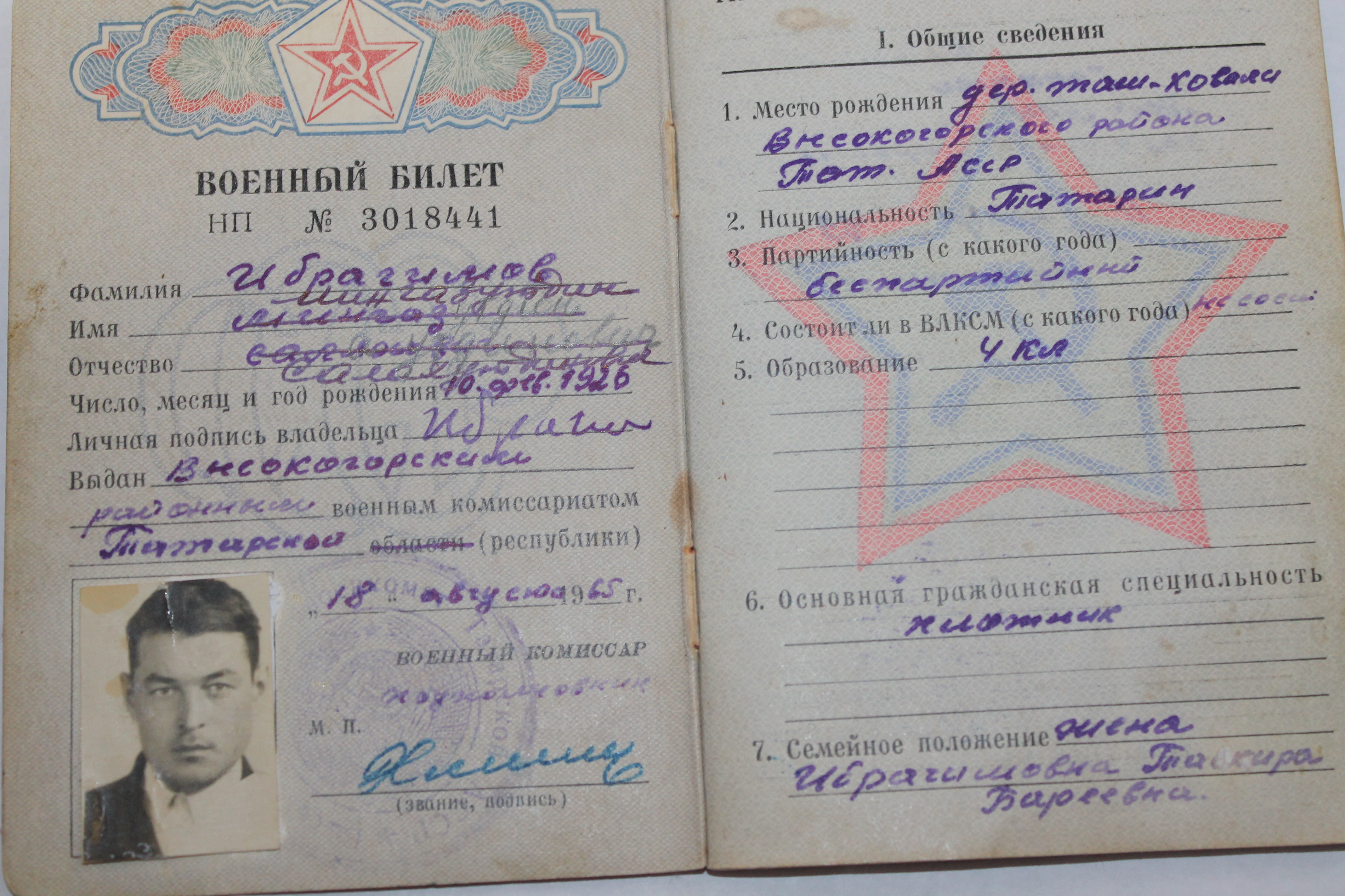 После войны работал в Сызрани на сланцевых шахтах. Потом на Кемеровской областной железной дороге. В 1953 году 20 мая женился. У меня 3 детей: два сына - Минхат и Ринат, и одна дочь - Гульфия. Есть внучка Алина. Я ведь 35 лет проработал в совхозе строителем.»