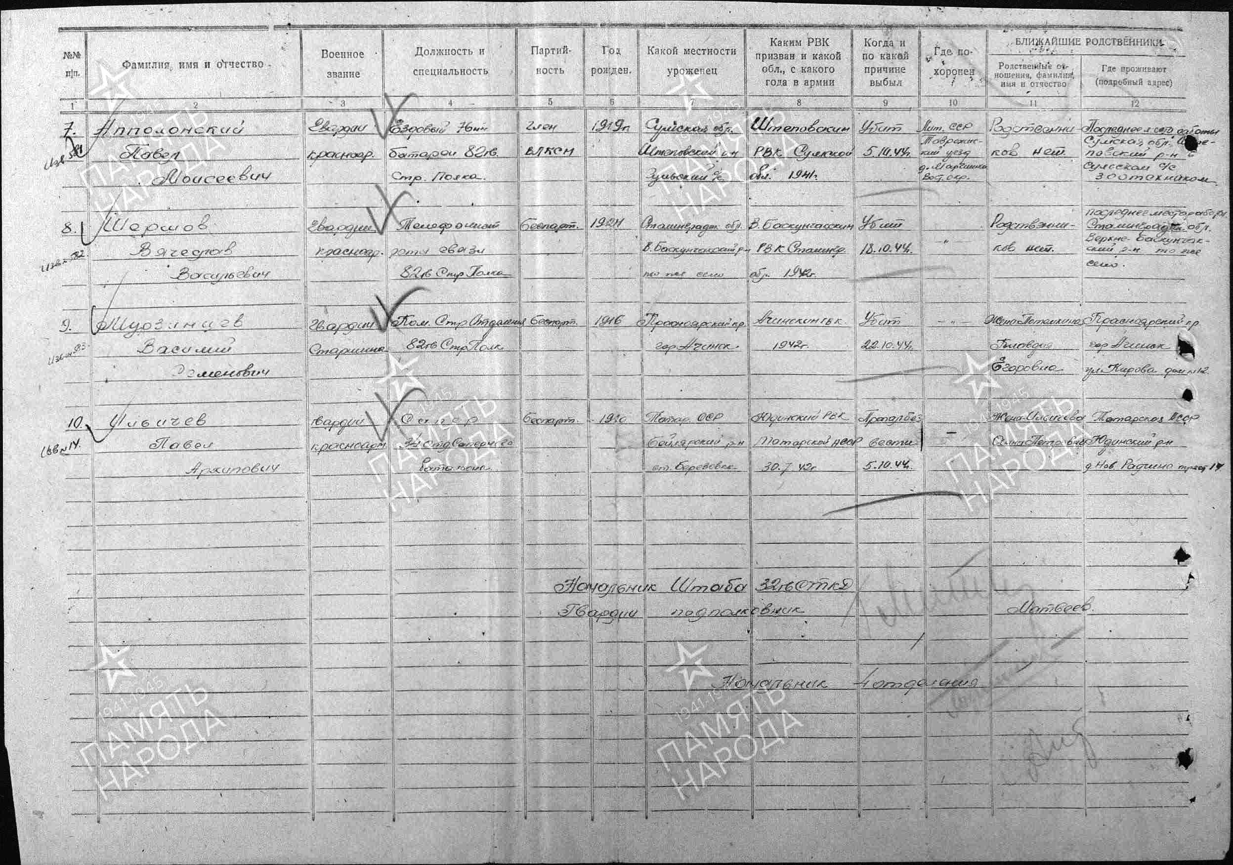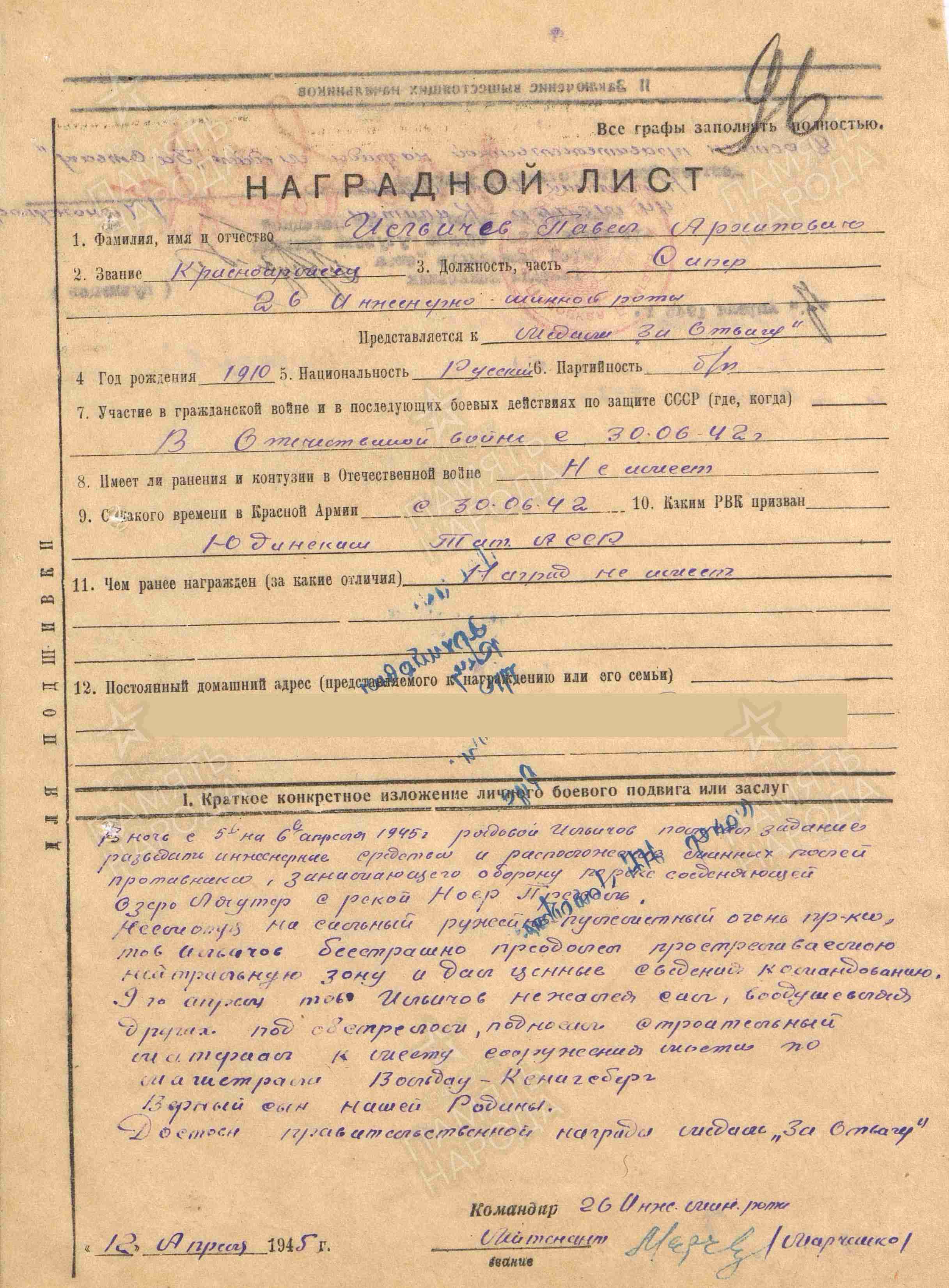 ИЛЬИЧЁВ Павел Архипович, 1910, д. Берёзовка. Мобилизован 1 авг. 1942 Юдинским РВК. Воевал в составе 44 МСБр 1 ТК/ 2 гв. А/ 51 А 1 Прибалтийского фронта, красноармеец, сапёр. Перенёс ранение 27 июня 1944. Ошибочно учтён пропавшим без вести 5 окт. 1944 в Литовской ССР. В 1945 – гв. красноармеец, сапёр инженерно-минной роты 34 гв. отд. сапёрного батальона 32 гв. СД 2 гв. А 3 Белорусского фронта. Награждён двумя медалями «За отвагу».