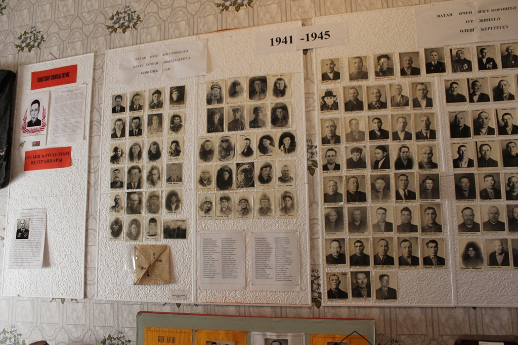 В третьем разделе музея - история ВОВ ,65 лет Победы - «Батырлар даны мэнгелек» В неё входят экспонаты военной поры: солдатские письма, часть противогаза, остаток каски,каска, фляжка,; письма с фронта, рукописи, вспомогательный фонд музея состоит из пяти стендов, на которых размещены фотографии ветеранов ВОВ, «Мы помним, мы гордимся» (Ветераны Великой Отечественной войны); «Утлы дуга батыры»; «Время уходит ,память остается»; исследовательские работы об участниках земляках войны,в Афгане и Чечне, о ветеранах тыла; и т.д. В экспозицию включены презентации учащихся и педагогов.