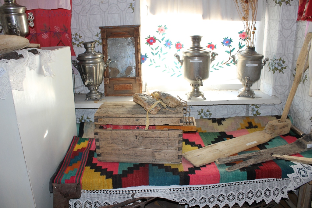 В четвёртом разделе музея - крестьянская изба, интерьер дома. В экспозицию включены ценные экспонаты: вышивки, ткани, паласы, полотенца, кружевные накидки, наволочки и т. п. Вязаная кручком сорочка , простроченные ичиги, калфак , тюбетейка, национальные платья, камзол.