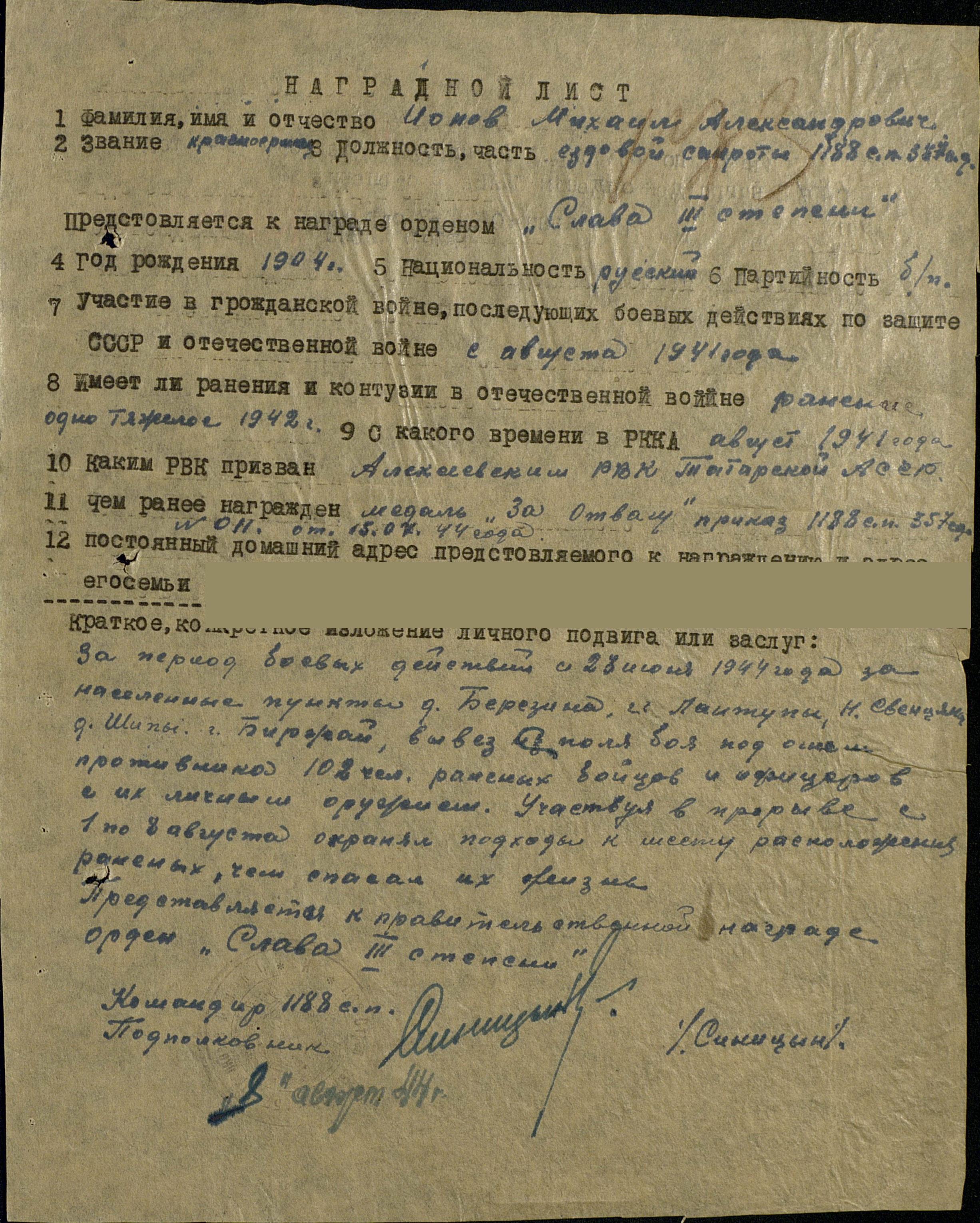ИОНОВ Михаил Александрович, 1904, с. Лебедино. Мобилизован Алексеевским РВК в августе 1941. Красноармеец. Воевал на Калининском фронте и был тяжело ранен 12 декабря 1942. После излечения - повозочный санитарной роты 1188 СП 357 СД 84 СК 4 УдА и 1 СК и 60 СК 43 А 1 ПрибалтФ. Проявляя мужество и бесстрашие, в течение 1944 года в боях за Белоруссию и Латвию вывез с поля боя несколько десятков раненых бойцов и командиров. Награждён медалью "За боевые заслуги", орденом Славы 3 ст.