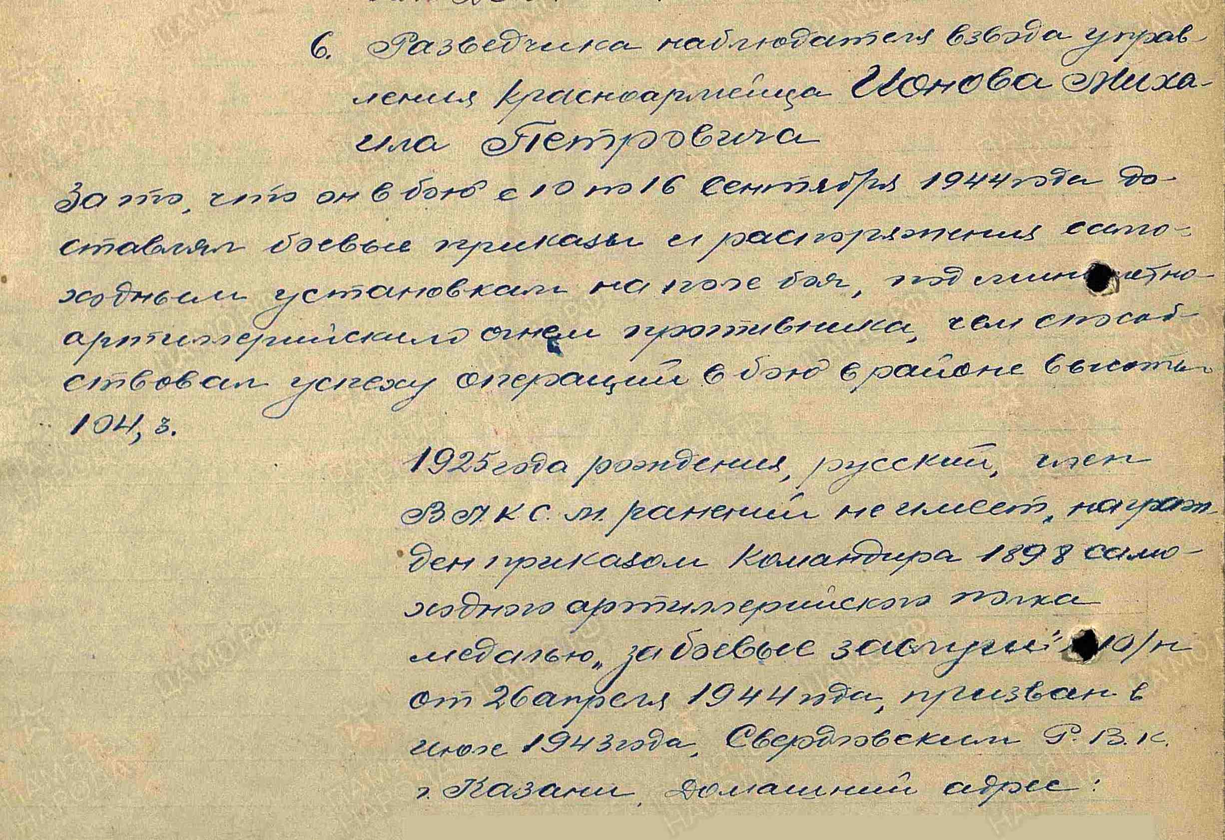ИОНОВ Михаил Петрович, 1925, с. Лебедино. Член ВЛКСМ. Мобилизован 27 июля 1943 Свердловским РВК г. Казань. Прошёл подготовку в 6 учеб. автомобил. полку. Воевал на 1/ 2 Украинском, 1/ 2 Белорусском фронте в составе 40 А/ 28 А/ 70 А. Участник освобождения Украины, Белоруссии, Польши. Красноармеец/ мл. сержант, шофёр взвода боепитания/ разведчик-наблюдатель взвода Управления 1898 САП. Награждён медалями «За боевые заслуги», «За отвагу».