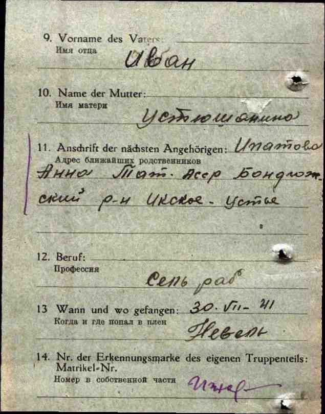Красноармеец, под Невелем попал в плен 30.07.1941. Лагерный номер 1931, шталаг XX C (312).