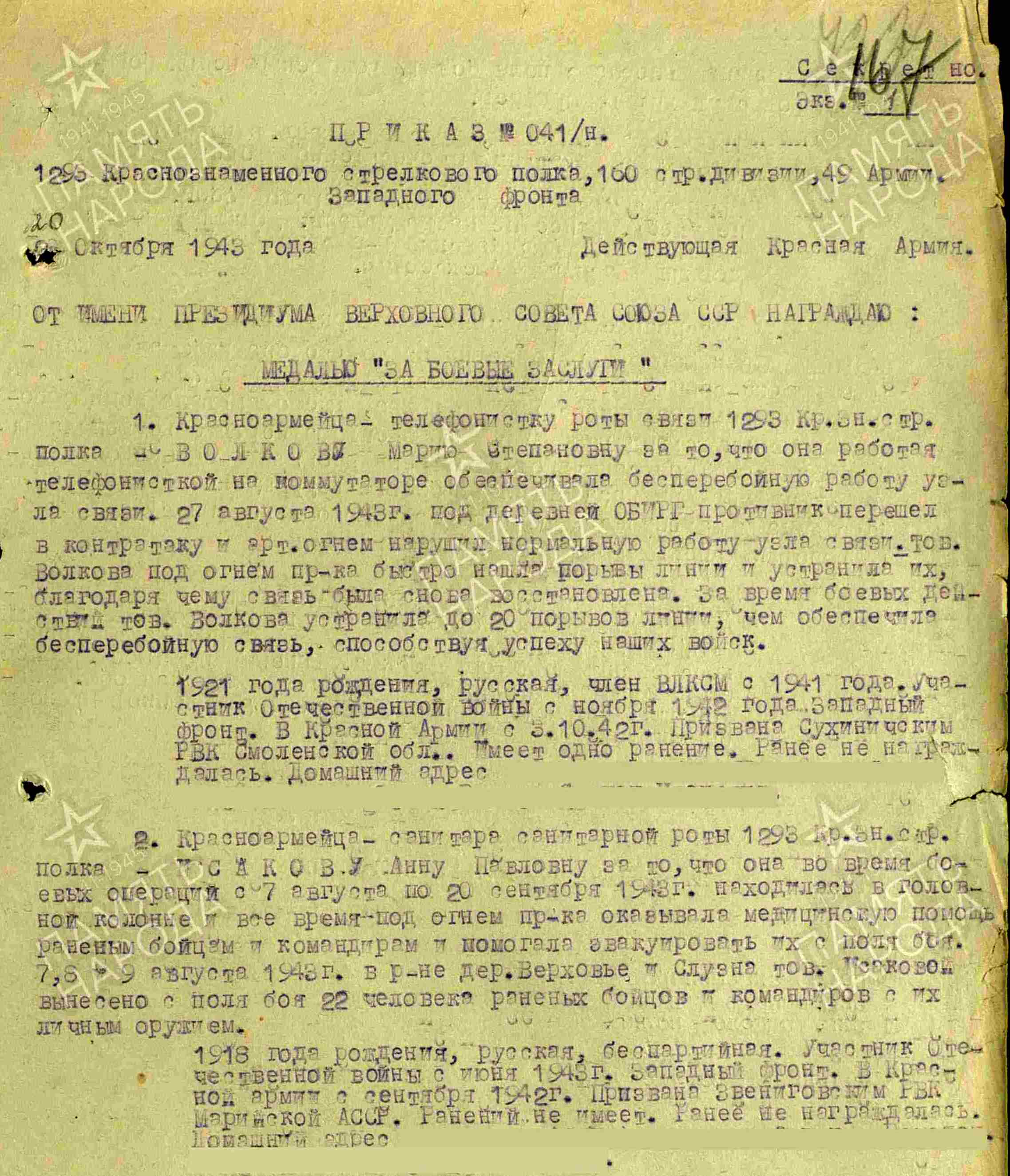ИСАКОВА Анна Павловна, 1918, с. Ромодан. Мобилизована Звениговским РВК МарАССР 20 сент. 1942. До мая 1943 служила в 1204 ЗенАП Московского фронта ПВО. На фронте с июня 1943. Красноармеец, санитар санитарной роты 1293 СП 160 СД 33 А/ 70 А/ 49 А/ 10 А Западного фронта, 70 А 2 и 1 Белорусского фронта. Оказывала медицинскую помощь бойцам и командирам, эвакуировала их с поля боя вместе с личным оружием. Награждена двумя медалями «За боевые заслуги».