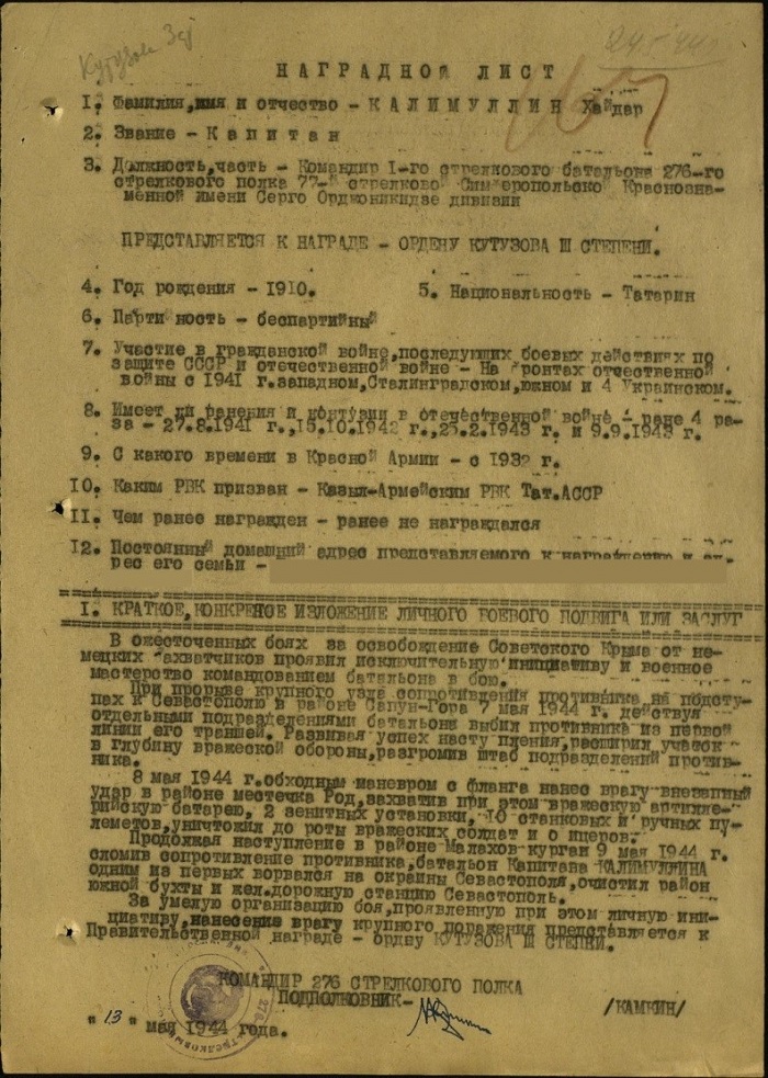 «Представляется к награде – Ордену Кутузова III степени…», - четкими буквами выбито штабной печатной машинкой на наградном листе командира стрелкового батальона Хайдара Калимуллина. На пожелтевшей от времени реликвии запечатлен подвиг комбата в мае 1944 года в Севастополе.