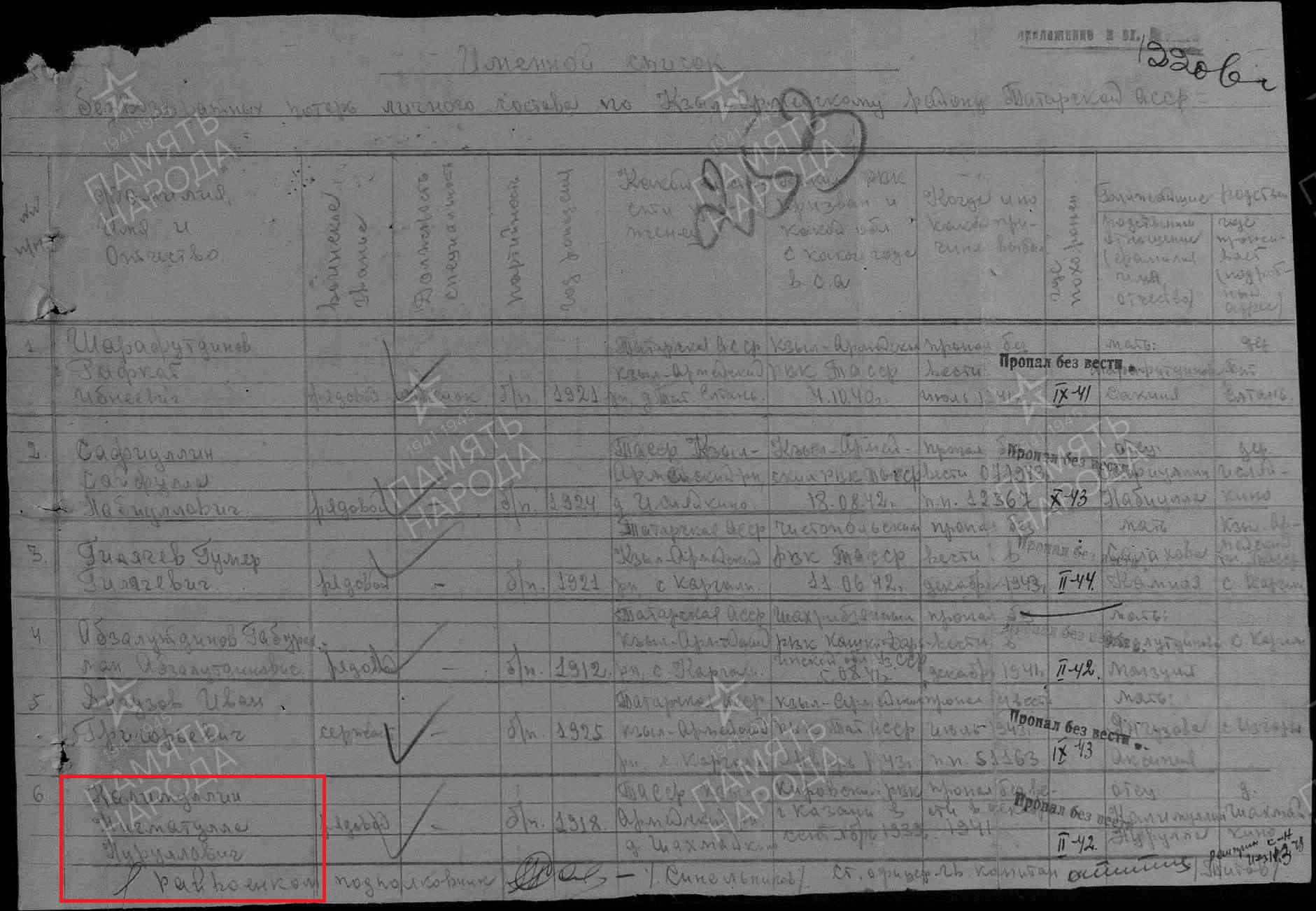 КАЛИМУЛЛИН НИГМАТУЛЛА НУРУЛЛОВИЧ родился в 1918 году в с.Шахмайкино Казанской губернии Чистопольского уезда Каргалинской волости (ныне с.Шахмайкино Новошешминского района РТ). Мобилизован Чистопольским РВК(Кировским РВК Казани),кр-ц,1129 сп,337 сд. Причина смерти: убит 12.09.44.г. Область выбытия: Румыния, с.Лэзерень.Госпиталь 421 омедсб.