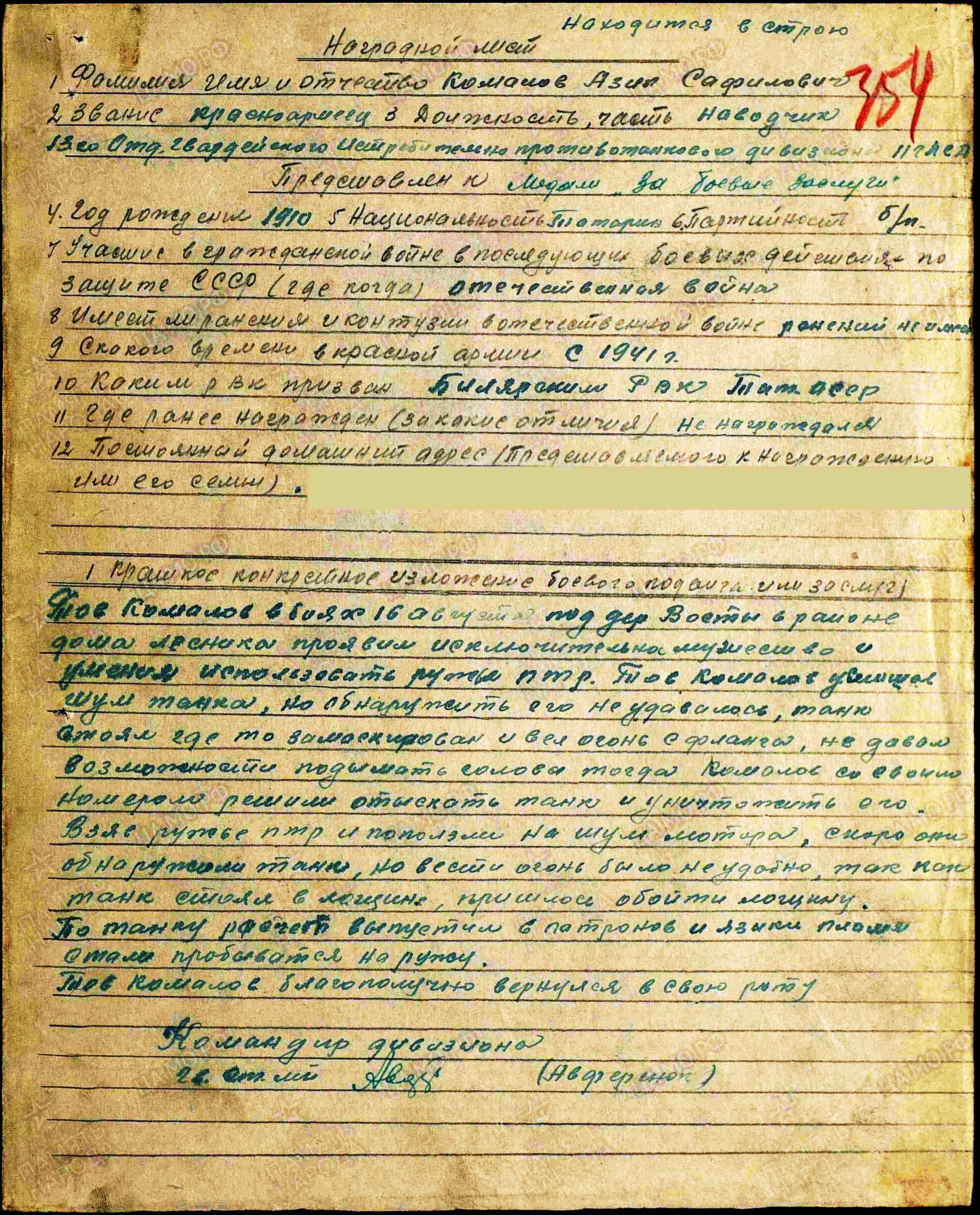 КАМАЛОВ Хазип Сафинович, 1910, с. Большие Тиганы. Мобилизован 17 июля 1941 Билярским РВК. На фронте с апр. 1942. Гв. красноармеец, наводчик орудия и ПТР 13 гв. ИПТДн 11 гв. СД 16 А/ 11 гв. А Западного/ Брянского/ 2 и 1 Прибалтийского фронта. Награждён медалью «За боевые заслуги». Письменная связь с семьёй прекратилась с 20 фев. 1944. Учтён пропавшим без вести.
