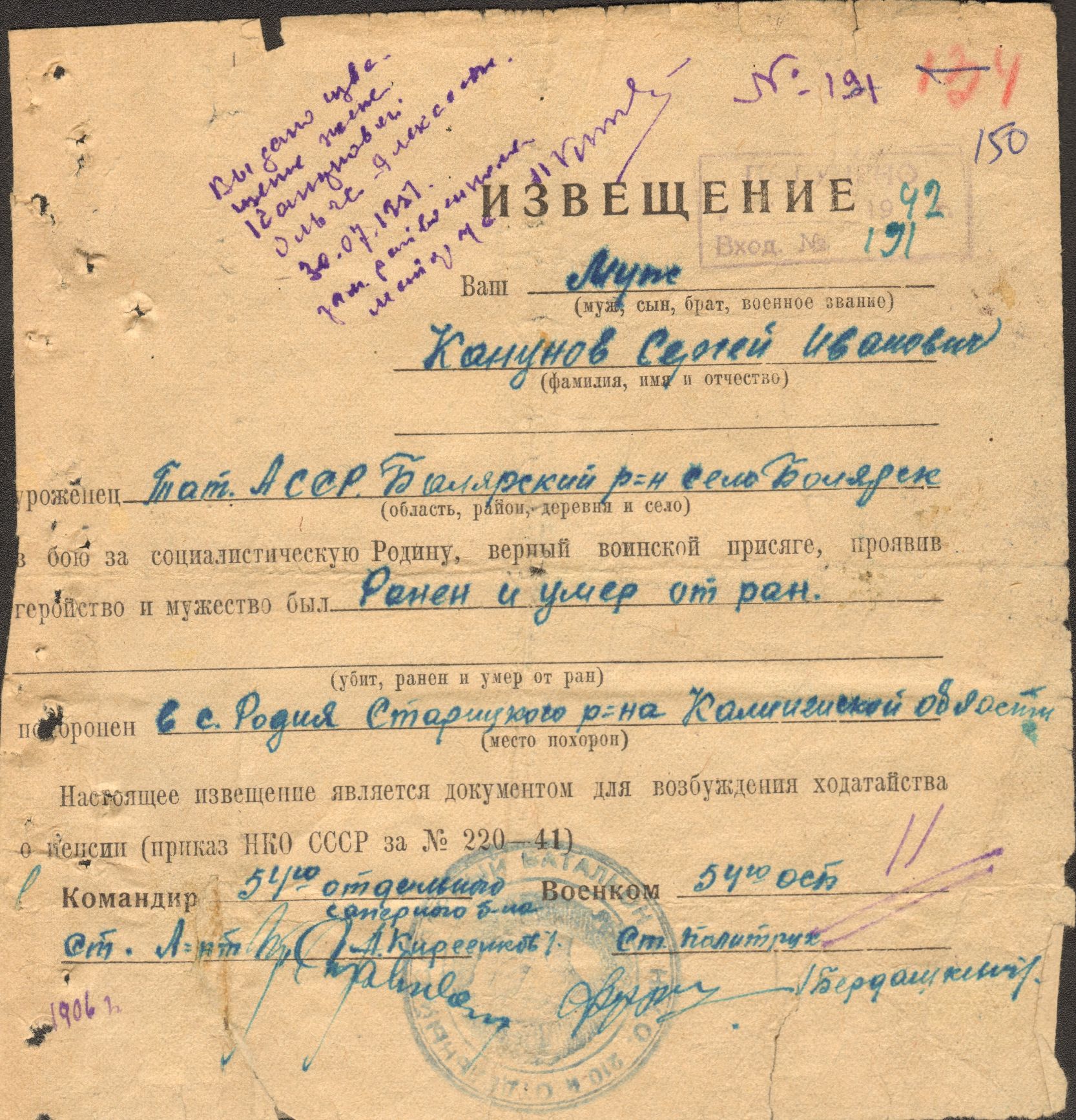КАНУНОВ Сергей Иванович, 1908, с. Билярск. Мобилизован Билярским РВК 24 июня 1941. Красноармеец, 54 отдельный саперный батальон 5 СД 30 А/ 31 А Калининского фронта. 6 января 1942 ранен и умер от ран 9 января. Похоронен в д. Родня, Старицкого района Калининской (Тверской) области.
