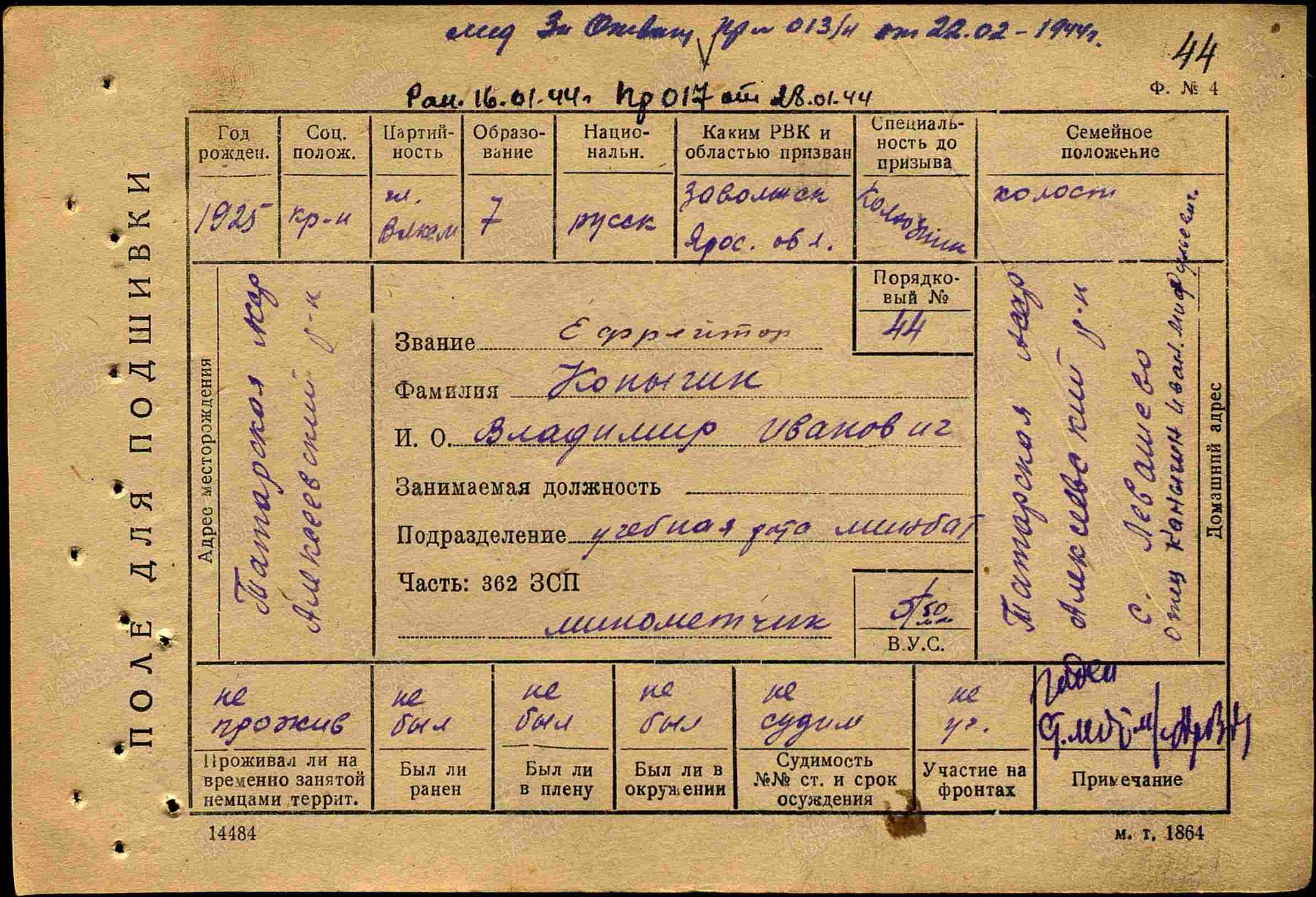 КАНЫГИН (КОНЫГИН) Владимир Иванович, 1925, с. Левашёво. Мобилизован Заволжским РВК г. Ярославль 2 фев. 1943. Член ВЛКСМ. Воевал на Западном, 2 и 1 Прибалтийском фронте в составе 10 гв. А/ 11 гв. А. Участник освобождения Белоруссии. Гв. красноармеец/ гв. ефрейтор, миномётчик/ телефонист роты связи 63 гв. СП 22 гв. СД/ 169 гв. СП 1 гв. СД. Награждён медалью "За отвагу". Ранен 16 янв. 1944. После госпиталя участвовал в освобождении Псковщины. Тяжело ранен и умер от ран 22 апр. 1944 в ЭГ (ППГ) 2205, с. Выбор, Новоржевский р-н, Псковская обл., кл-ще д. Моисеево. Увековечен на братском захоронении в д. Боровка, Куньинский р-н, Псковская обл.