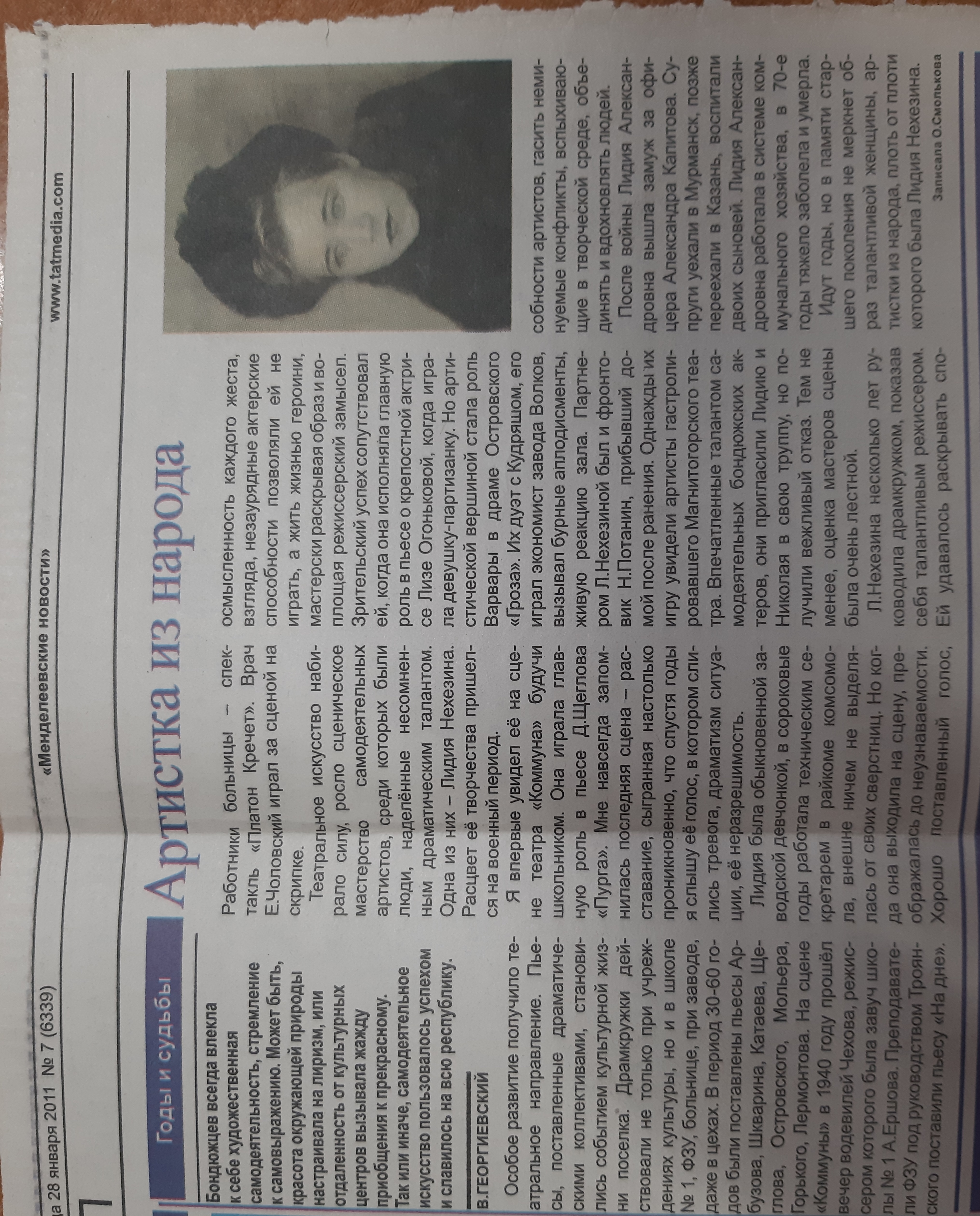 Родилась 1916 г.р., пос.Бондюга ТАССР. В годы Великой Отечественной войны работала секретарем комсомольской организации химзавода им.Карпова, старшим инспектором отдела гособеспечения семей военнослужащих. Руководила драматическим кружком, была очень одаренной актрисой. Ветеран войны и труда Владимир Георгиевский вспоминал: «Когда она выходила на сцену, преображалась до неузнаваемости. Хорошо поставленный голос, осмысленность каждого жеста, взгляда, незаурядные актерские способности позволяли ей не играть, а жить жизнью героини. Артистической вершиной для нее стала роль Варвары в драме Островского «Гроза». Гастролировавшие артисты Магнитогорского театра, увидев Л.Нехезину на сцене, пригласили ее в свою труппу, но получили отказ. После замужества Л.Нехезина уехала из Бондюги.