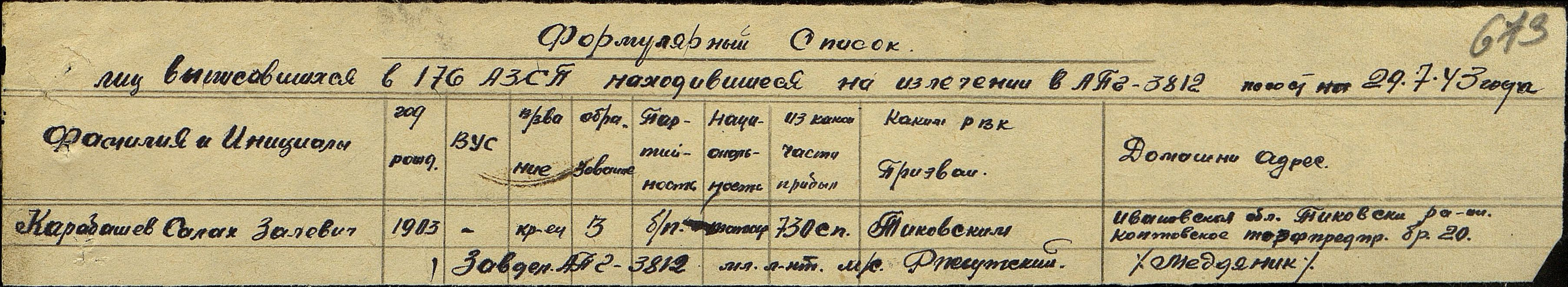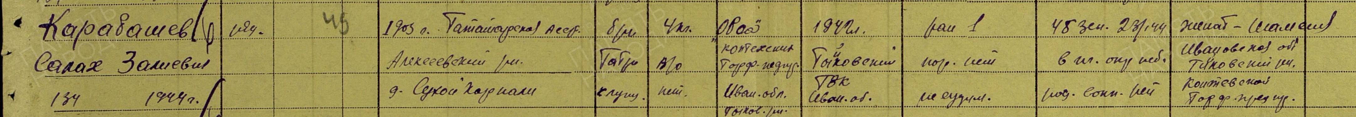 КАРАБАШЕВ Салах (Салахетдин) Залялович (Залялетдинович), 1903, с. Сухие Курнали. До декабря 1942 находился на торфоразработках в Ивановской обл. Мобилизован Тейковским РВК 16 дек. 1942. Красноармеец, стрелок. Принимал участие в битве на Курской дуге в составе 730 СП 204 СД 6 гв. А. 14 июля 1943 был легко ранен осколком снаряда в спину. Находился на излечении в Армейском полевом госпитале 3812 (Курская обл.) и ЭГ 3311. Далее воевал на 1 ПрибалтФ. В 1945 по представлению 204 Фронтового запасного стрелкового полка награждён медалью "За боевые заслуги".