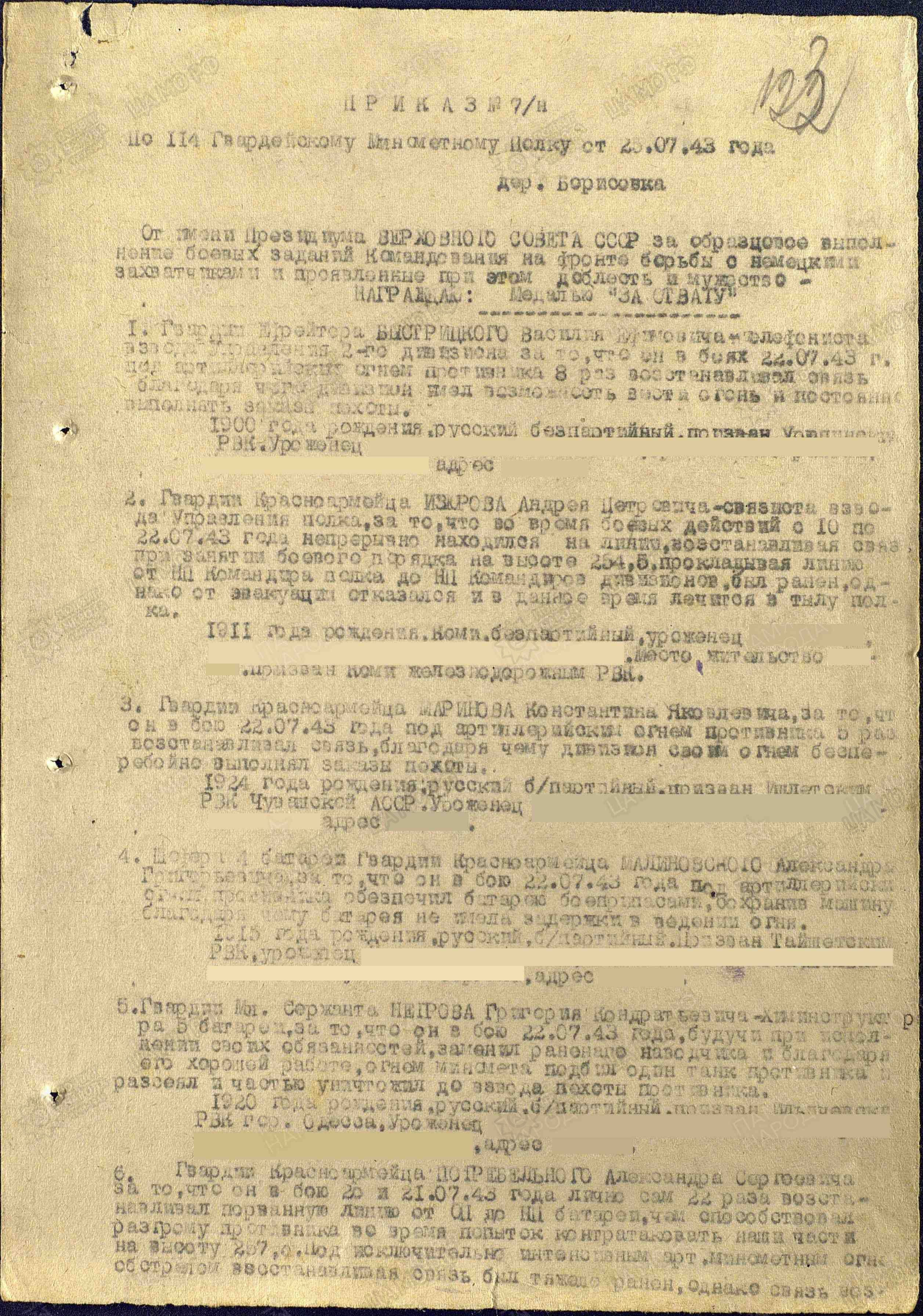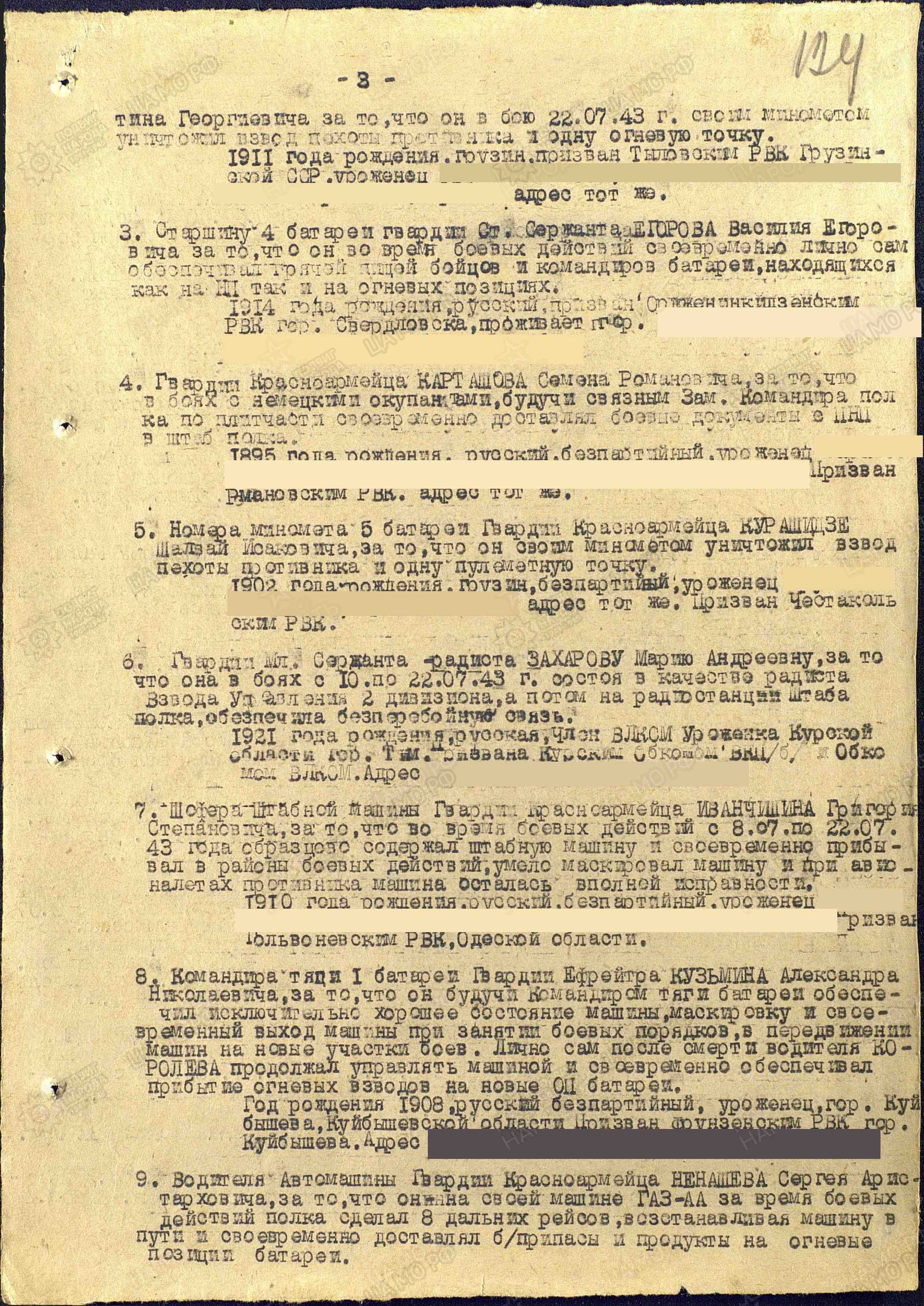 Из приказа: «Номера миномета 5 батареи Гварди красноармейца Курашидзе Шалвай Исааковича, за то, что он своим минометом уничтожил взвод пехоты противника и одну пулеметную точку».