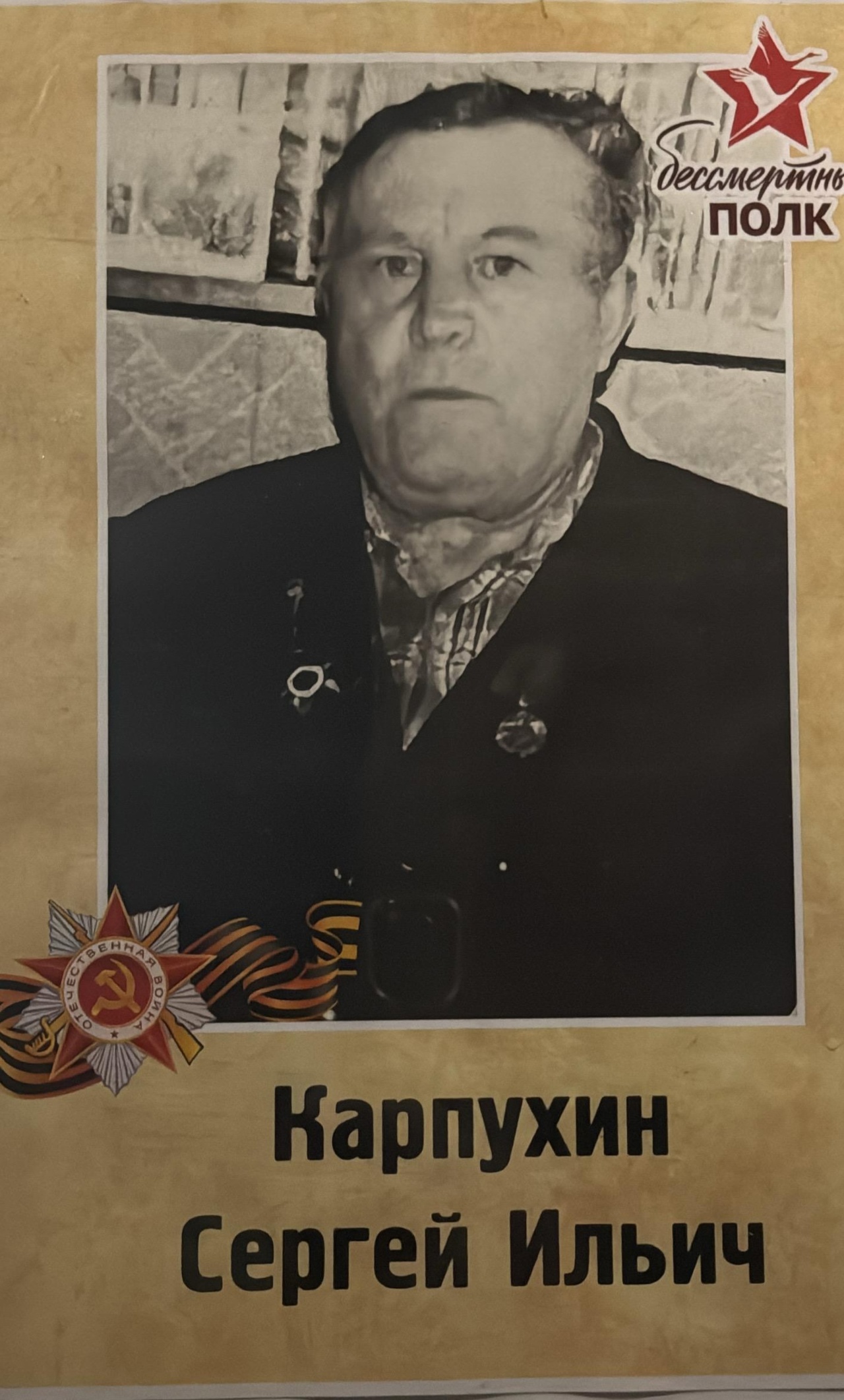 Карпухин Сергей Ильич родился 22.09.1922 г в семье крестьянина Ильи Ивановича Карпухина и Варвары Георгиевны Плечковой в селе Красная поляна Тетюшского кантона. Был единственным сыном из 7- х их детей. В том далеком 1941 году в составе команды из 5-и лыжников отправляется из Тетюшского райвоенкомата в распоряжение штаба 20 запасной стрелковой бригады г. Казани. В декабре того же года зачислен в списки 16 западного лыжного полка для дальнейшего прохождения службы. Не имея возможности двигаться из-за ранения, получает обморожение стоп обеих ног. Стопы пришлось ампутировать. Обмороженные пальцы рук удалось сохранить. Был комиссован. Вернулся домой к матери и сёстрам, приняв на себя все мужские обязанности в семье, так как отец его умер от ран в госпитале в январе 1945 года. За отвагу и мужество, проявленные на фронте награжден орденом Отечественной войны I степени.