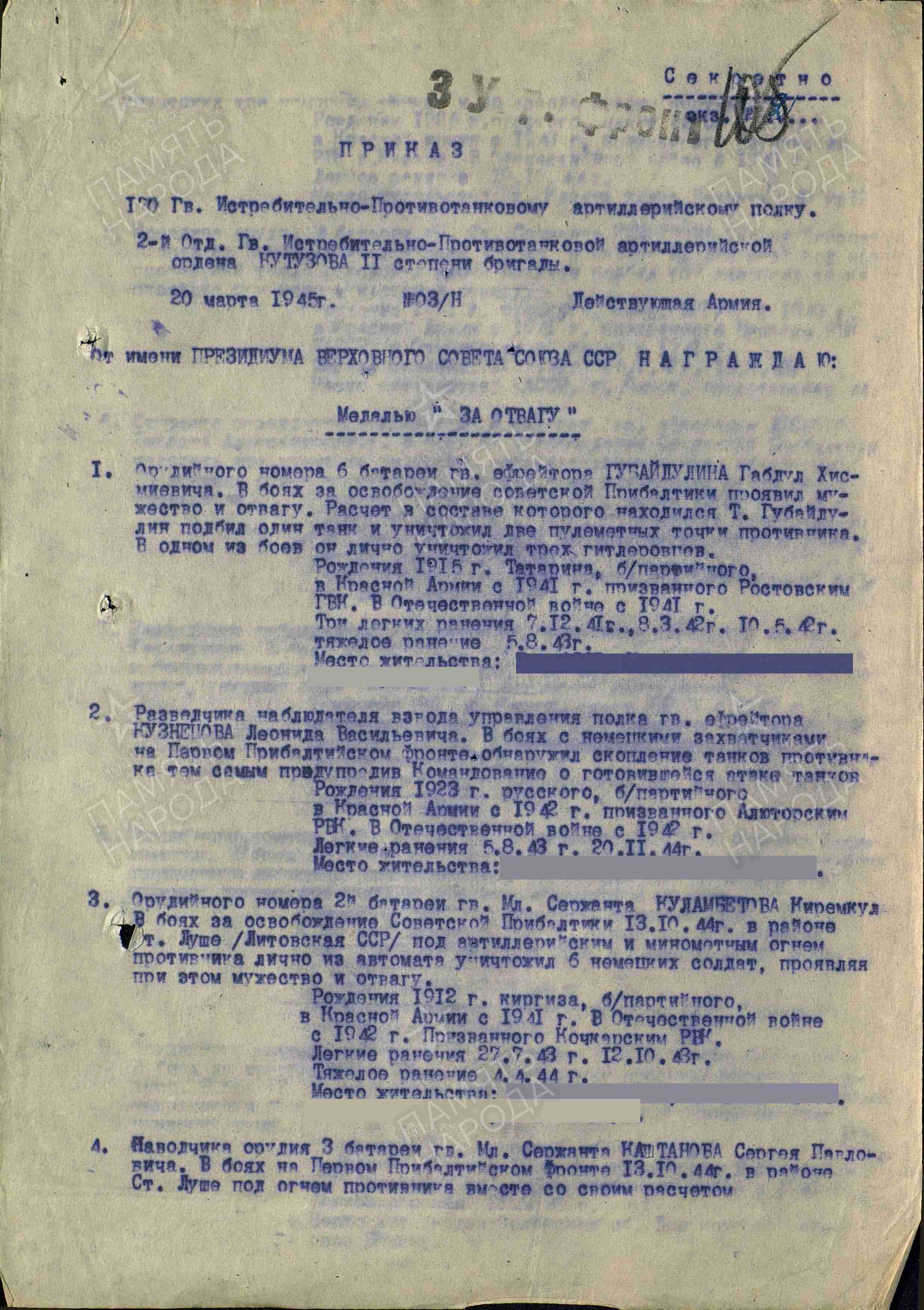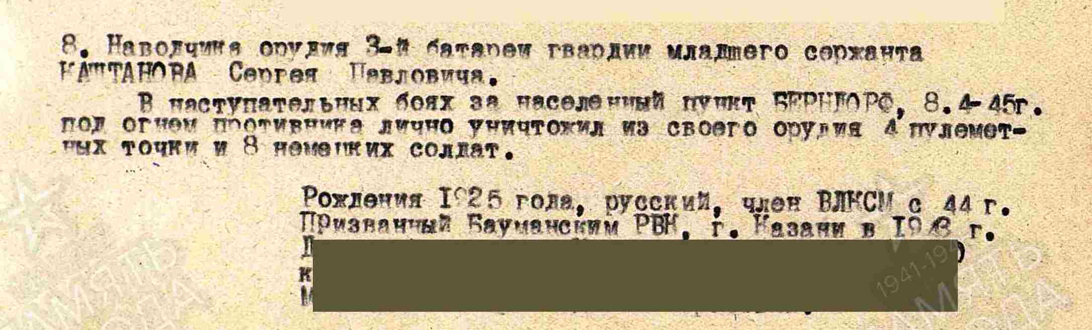 КАШТАНОВ Сергей Павлович, 1925, д. Берёзовка. Мобилизован в янв. 1943 Бауманским РВК г. Казань. Член ВЛКСМ. С июля 1943 воевал на Воронежском, Степном, 1 Прибалтийском, 2 и 3 Украинском фронте в составе 69 А/ 51 А/ 6 гв. А/ 7 гв. А/ 9 гв. А. Участник битвы на Курской дуге, освобождения Украины, Прибалтики, боёв в Венгрии и Австрии. Легко ранен 10 окт. 1944. Красноармеец/ гв. мл. сержант, наводчик орудия 1661 ИПТАП/ 170 гв. ИПТАП 36 ИПТАБр/ 2 гв. ИПТАБр. Награждён медалями «За отвагу», «За боевые заслуги», орденом Отечественной войны 2 ст. (1985).