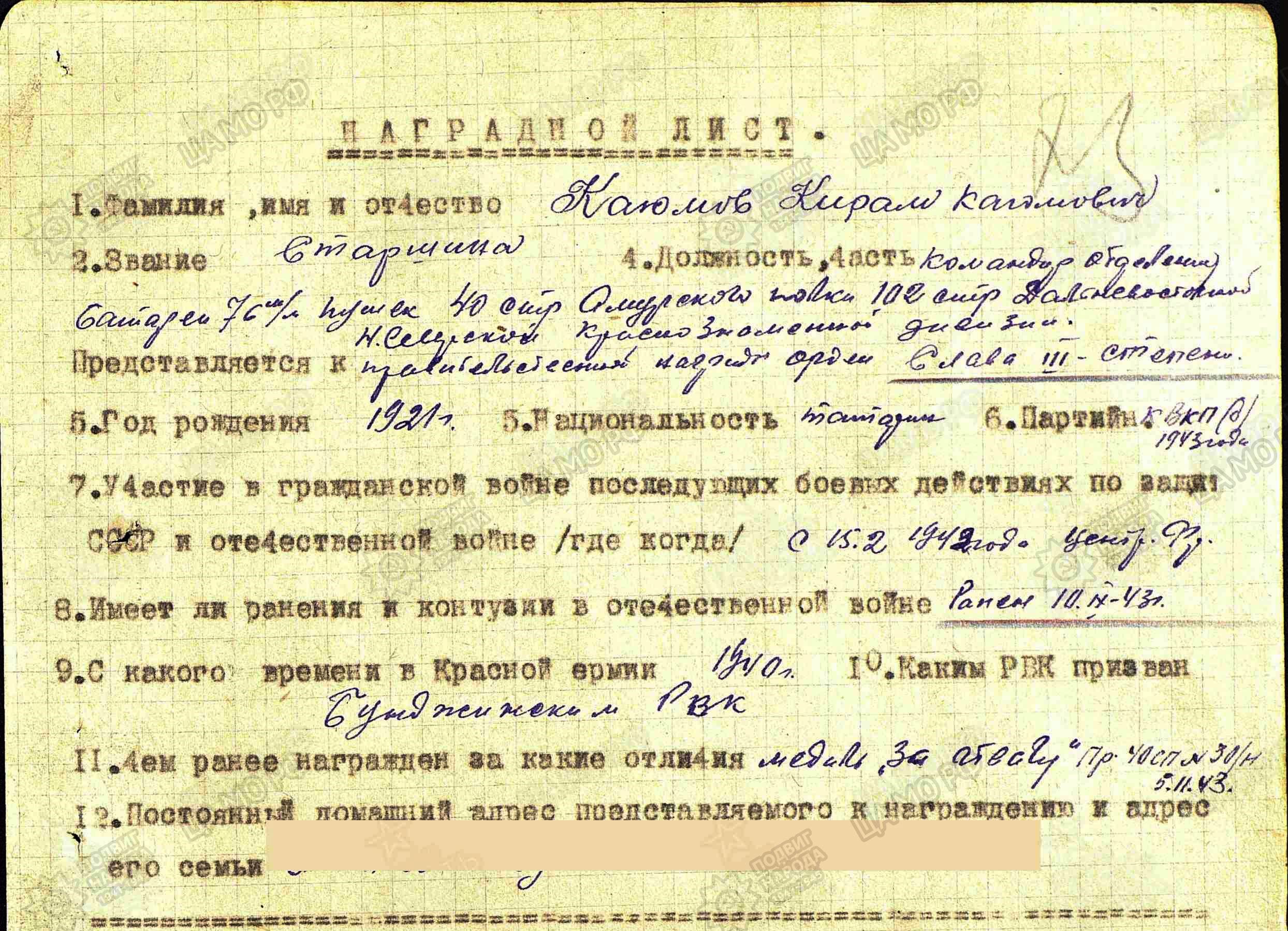 Старшина, командир взвода управления 76-мм батареи 40 стрелкового Амурского полка 102 стрелковой дивизии 48 армия Белорусского фронта. Был ранен.