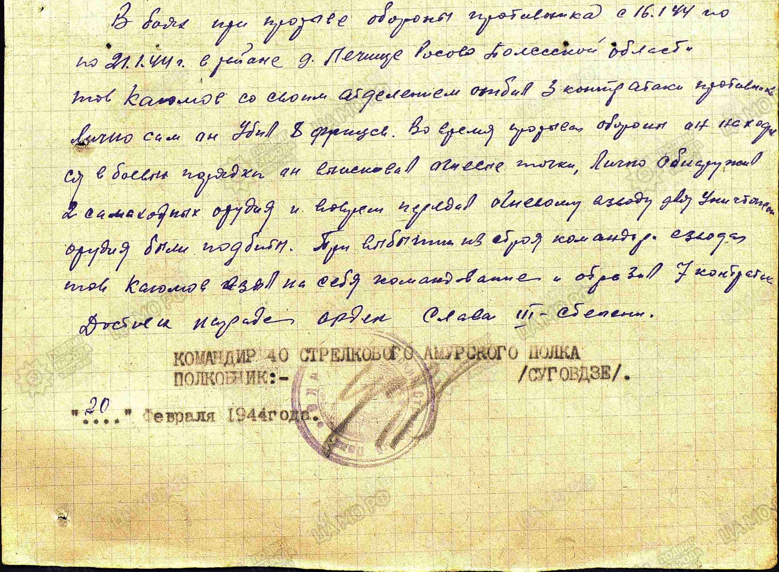 26.6.1944. под деревней Поболово пробрался в тыл немцам, перерезал телефонный провод и с группой разведчиков взял 25 пленных немецких солдат и офицеров».