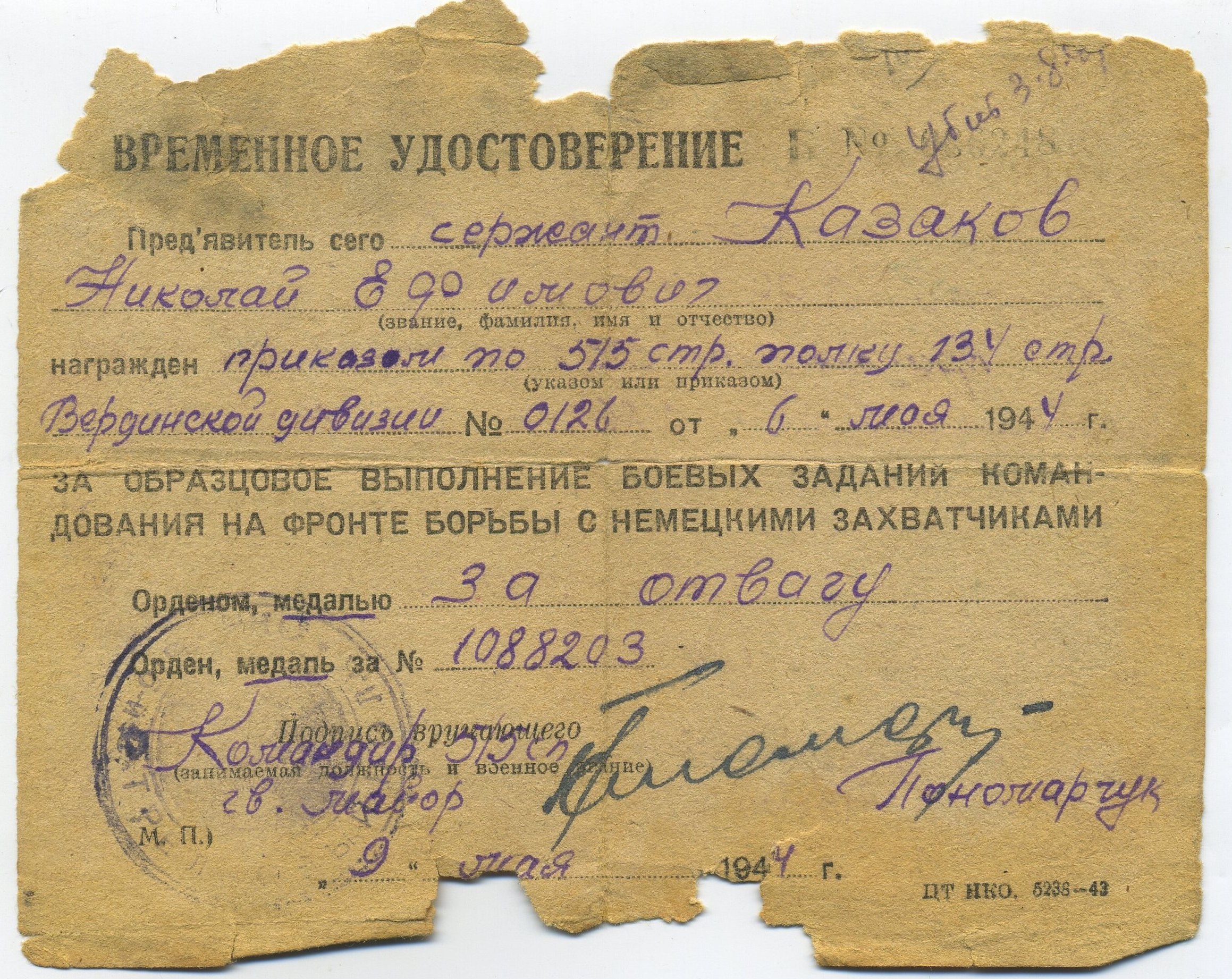 "Ветеран Отечественной войны, участник Московской битвы и боёв на Украине и подступах к Витебску в феврале м-це 1944г. 31.7.44г., подавая образцы героизма и мужества, под ураганным огнём врага одним из первых форсировал реку Висла. Немедленно по достижению западного берега реки вступил в бой, и, сражаясь до последнего патрона в отражении контратак немцев, стремившихся любой ценой ликвидировать наш плацдарм, пал смертью храбрых на поле боя, отдав жизнь делу разгрома врага. За героизм и мужество в этих боях т. Казаков представляется к званию «Героя Советского Союза».