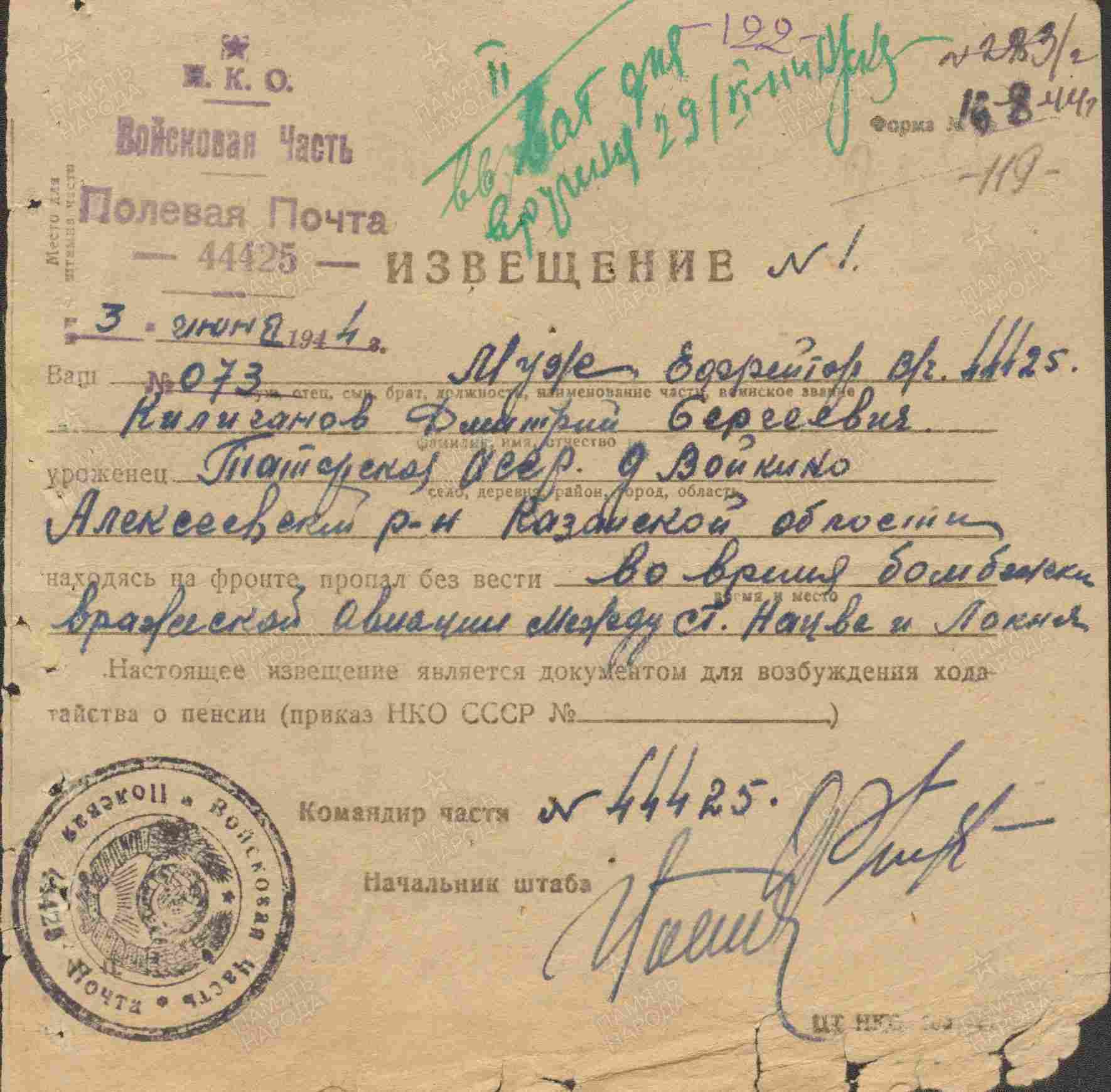 КИЛЬГАНОВ Дмитрий Сергеевич, 1911, д. Войкино. Мобилизован 4 июня 1942 Алексеевским РВК. Ефрейтор, 166 отд. рота обслуживания армейской базы 2 Прибалтийского фронта. Пропал без вести 7 мая 1944 во время бомбёжки эшелона на перегоне между станциями Локня, Локнянский р-н, и Насва, Новосокольнический р-н, Псковская обл.
