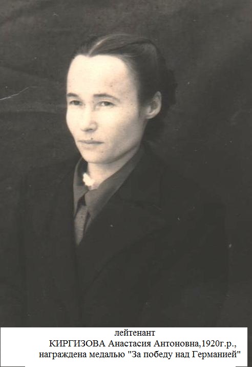 Киргизова Анастасия Антоновна родилась в 1920 году в селе Хурада Спасского уезда Казанской губернии (ныне Алькеевского р-на РТ). Участник Великой Отечественной войны. В Красной Армии с 1941г. Звание – лейтенант. Начальник аптеки.