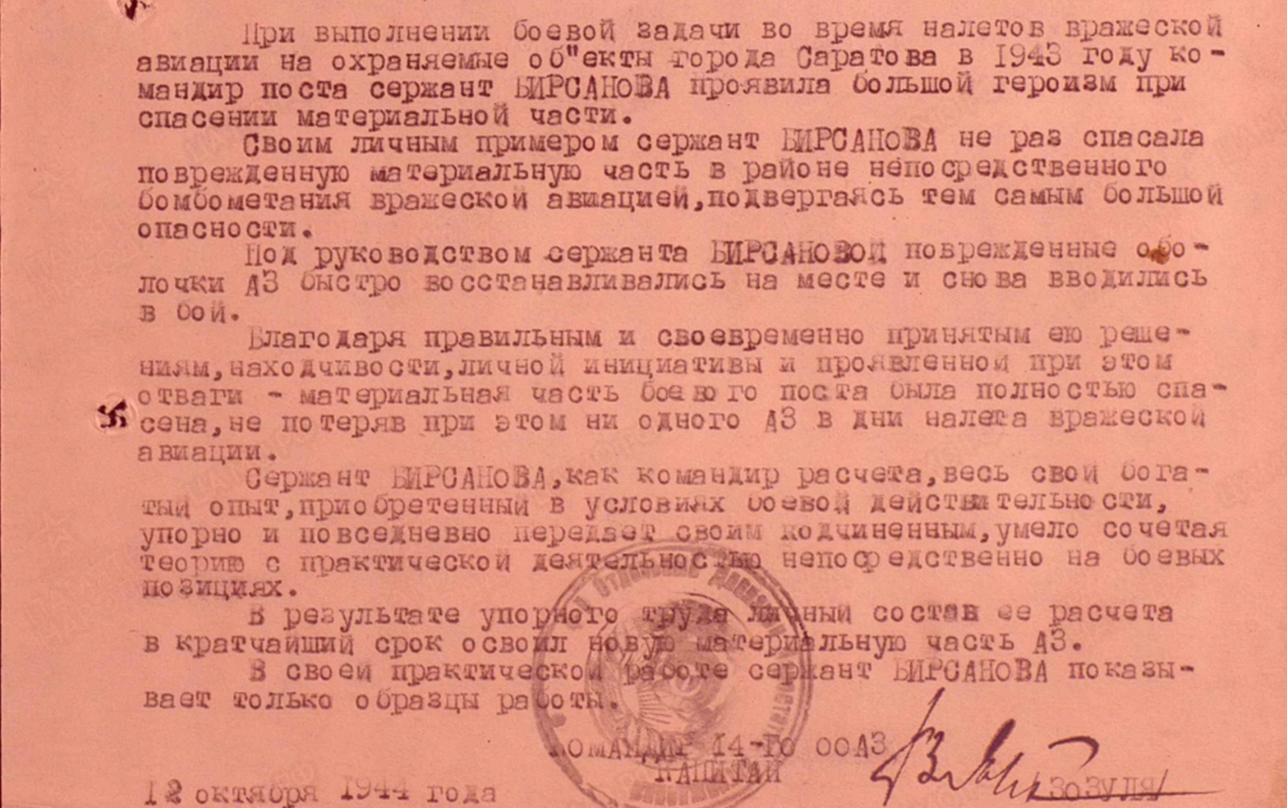 Кирсанова Тамара Степановна родилась в 1921 году. Звание: сержант в РККА с 06.1942 года. Место призыва: Ново-Шешминский РВК, Татарская АССР, Ново-Шешминский р-н. Место службы: 14 отд. отряд АЗ 7 корп. ПВО. 14.11.1944 года награждена Медалью «За боевые заслуги».