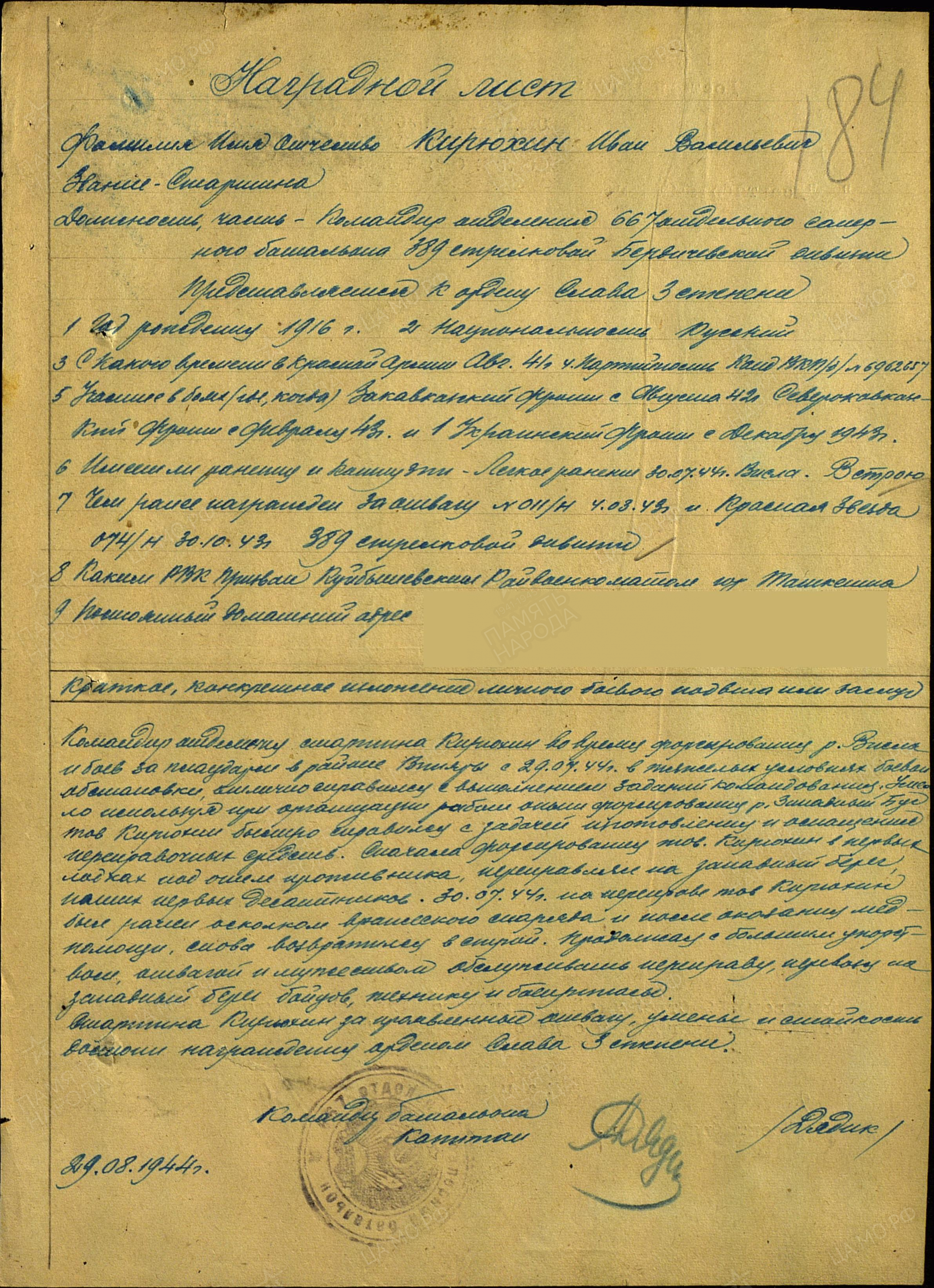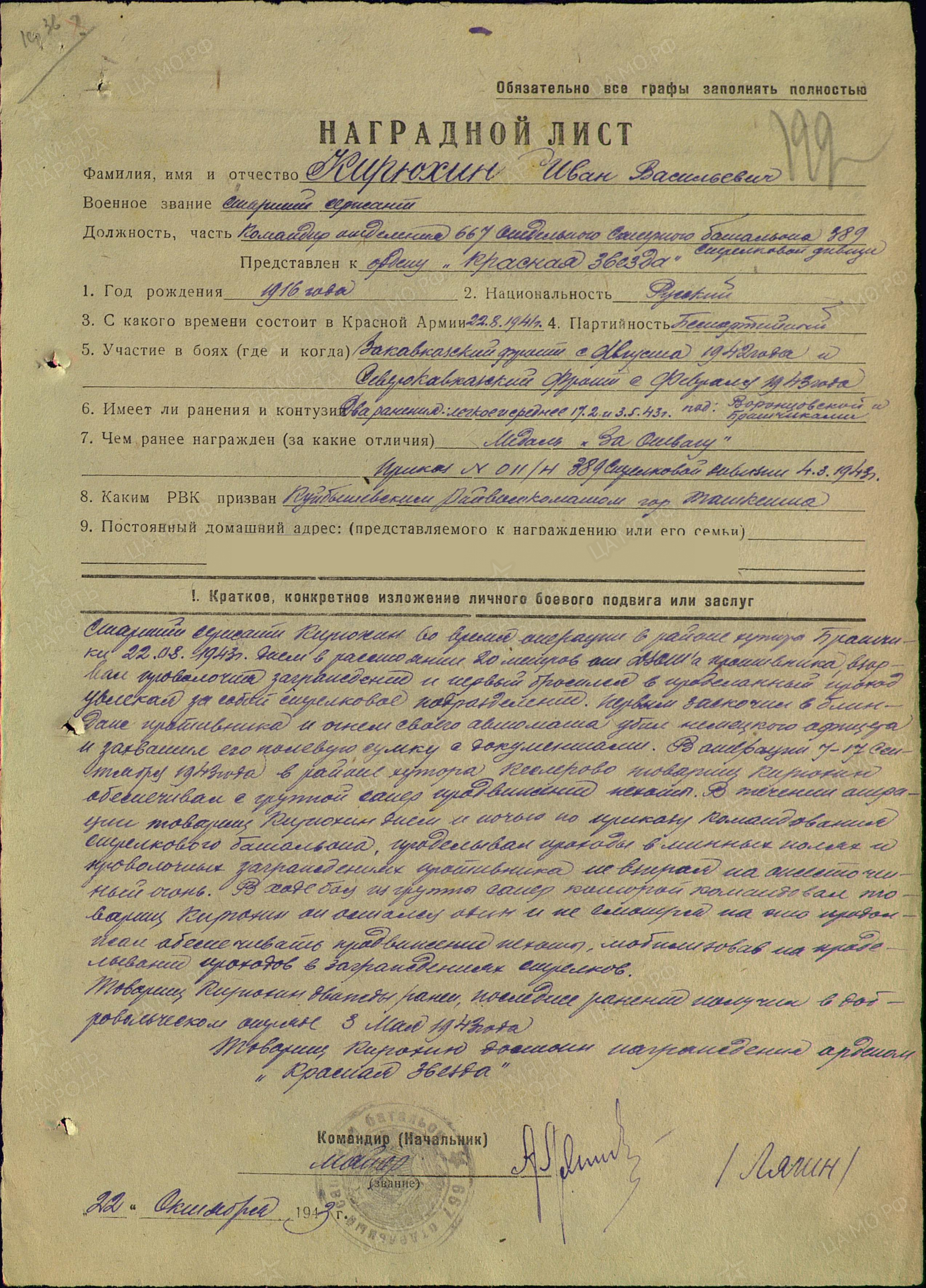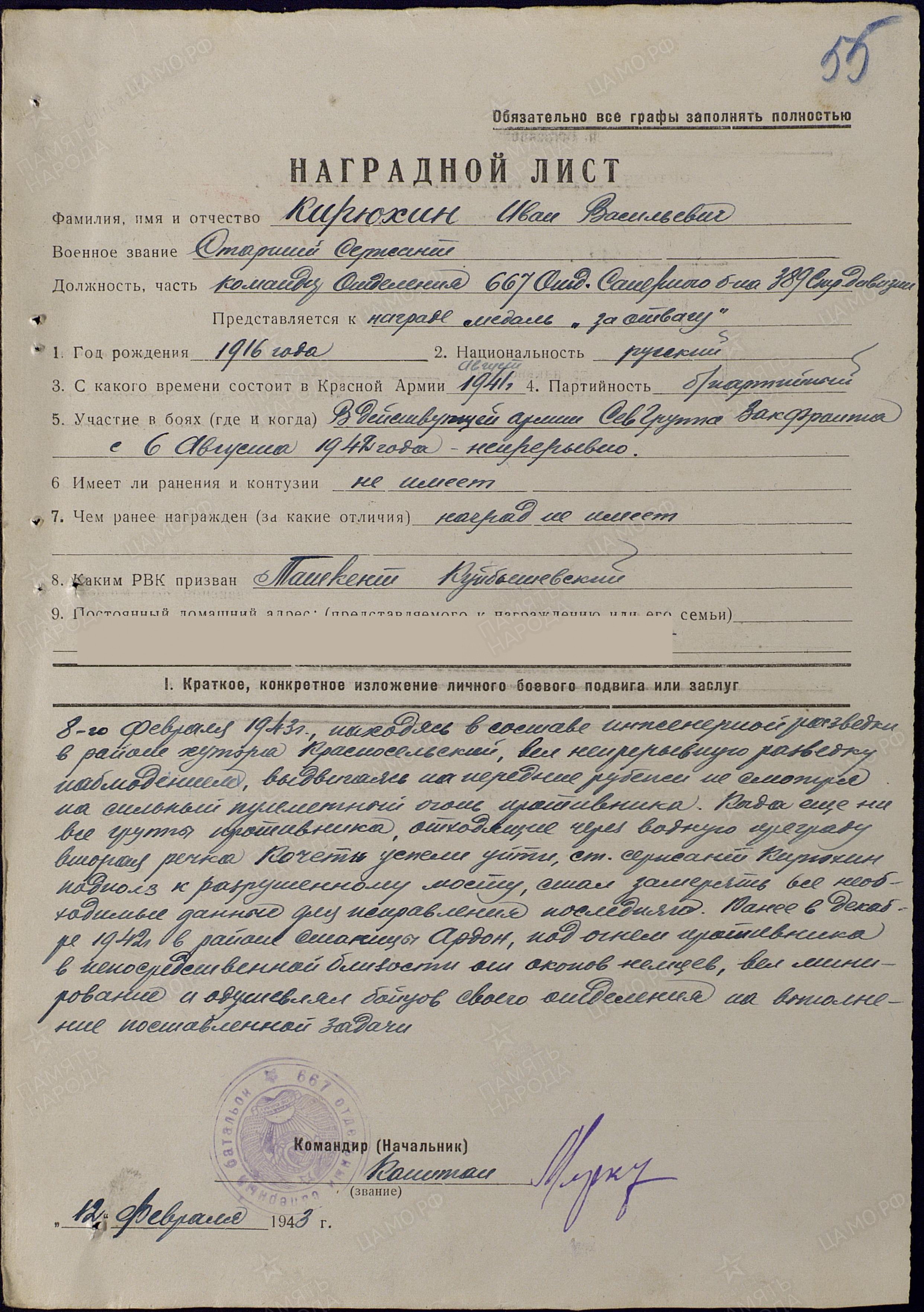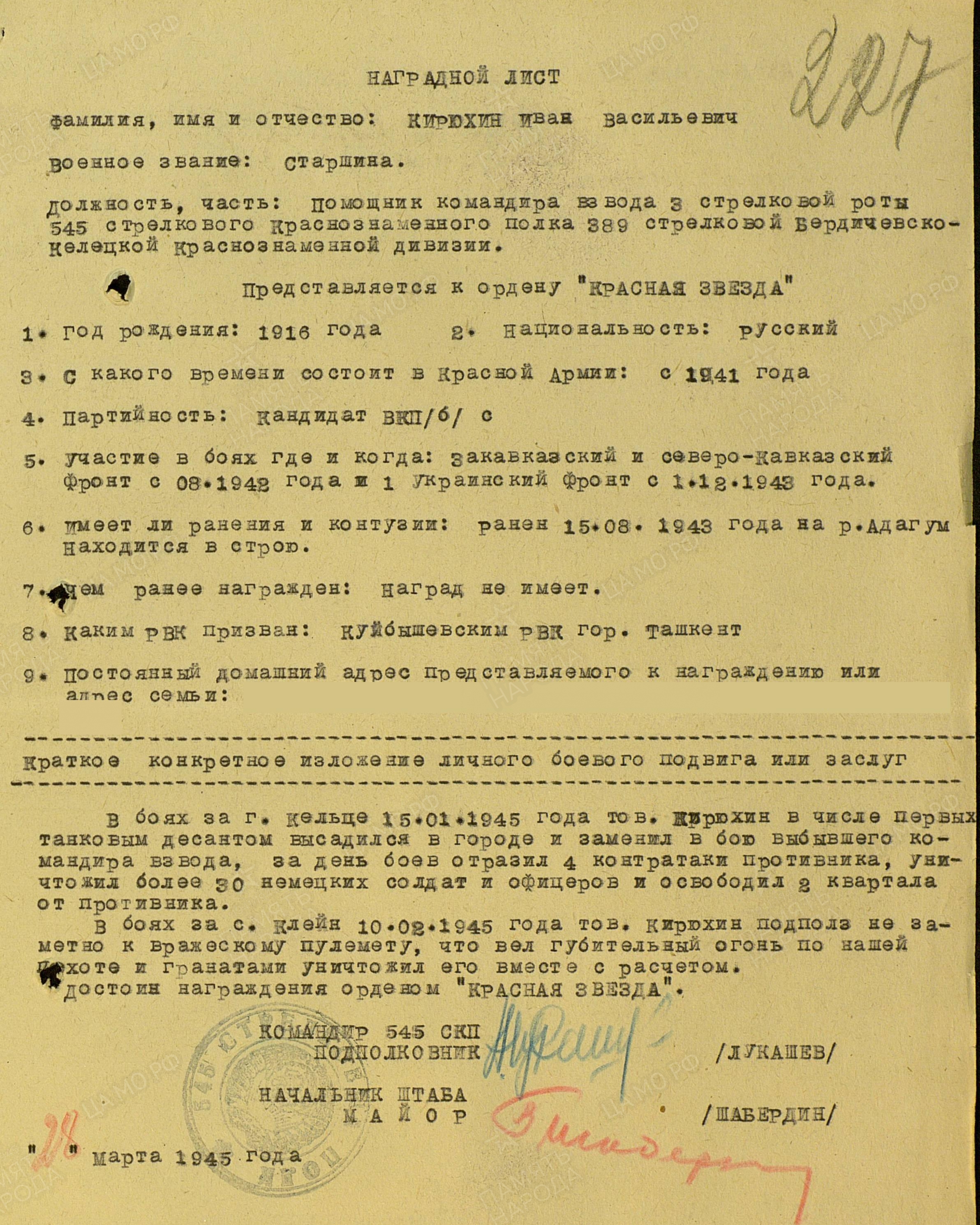 КИРЮХИН Иван Васильевич, 1916, с. Левашево. Мобилизован Куйбышевским РВК г. Ташкент в авг. 1941. Воевал на СКФ, ЗакФ, 1 УкрФ. Старшина, ком. отделения 667 ОСБ 389 СД. 8 фев. 1943, в составе инженерной разведки, в р-не хут. Красносельский, под огнём пулемётов выдвигался на передние рубежи, вёл минирование вблизи немецких окопов. 17 фев. и 3 мая 1943 был ранен. 22 авг. 1943, в дневное время, на расстоянии 20 м. от ДЗОТа противника взорвал проволочные заграждения и первый бросился в проход. Первым ворвался в блиндаж, огнём автомата убил немецкого офицера, захватил его полевую сумку с документами. В этом бою был ранен. 7-17 сент. 1943, в р-не хут. Кеслерово, с группой саперов обеспечивал продвижение пехоты. Под огнём врага проделывал проходы в минных полях и проволочных заграждениях. Оставшись в бою один из группы, мобилизовал стрелков и продолжал выполнять задачу. 30 июля 1944 был легко ранен осколком снаряда при форсировании р. Висла. Используя опыт форсирования Западного Буга, быстро справился с изготовлением и оснащением переправочных средств. Одним из первых, под обстрелом противника переправился, на западный берег. После перевязки остался в строю, продолжал обслуживать переправу. В 1945 выполнял обязанности пом. ком. взвода 545 СП той же дивизии. 15 янв. 1945, в бою за г. Кельце, в числе первых танковым десантом высадился в черте города, заменил выбывшего ком. взвода, за день отразил четыре атаки, уничтожил до 30 немцев. В бою за с. Клейн, 10 фев. 1945, незаметно подполз к вражескому пулемёту и используя гранаты, уничтожил его вместе с расчётом. Награждён медалью «За отвагу», двумя орденами Красной Звезды, орденом Славы 3 ст.