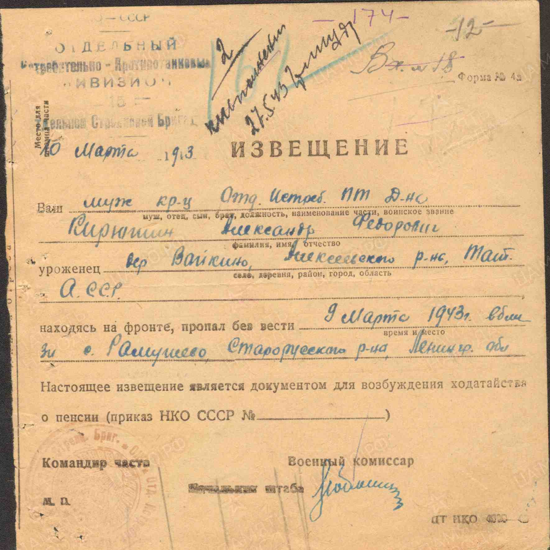 КИРЮШИН Александр (Андрей) Фёдорович, 1908, д. Войкино. Мобилизован Алексеевским РВК/ Реутовским РВК Московской обл. 15 марта 1942. Красноармеец, орудийный номер отд. ИПТДн 15 СБр 27 А/ 11 А Северо-Западного фронта. Пропал без вести 9 марта 1943 близ с. Рамушево, Старорусский р-н/ д. Ершино, Парфинский р-н, Новгородская обл.