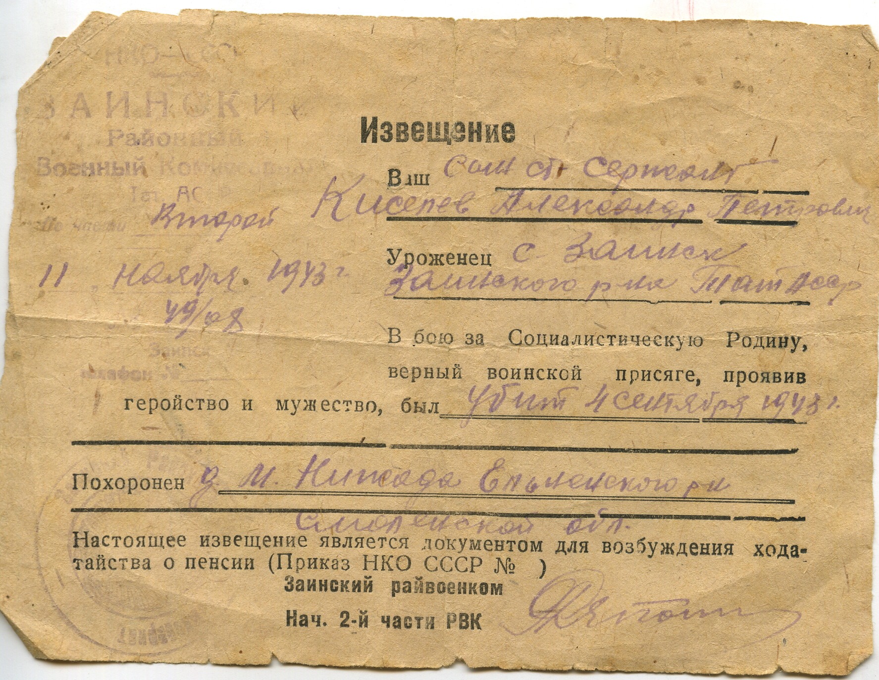 Киселев Александр Петрович родился в с. Заинск. Был мобилизован Заинским РВК. Служил в воинской части 53731 старшим сержантом. Погиб 4 сентября 1943 года. Захоронен в Смоленской области, Ельнинском районе, д. Малая Нежода
