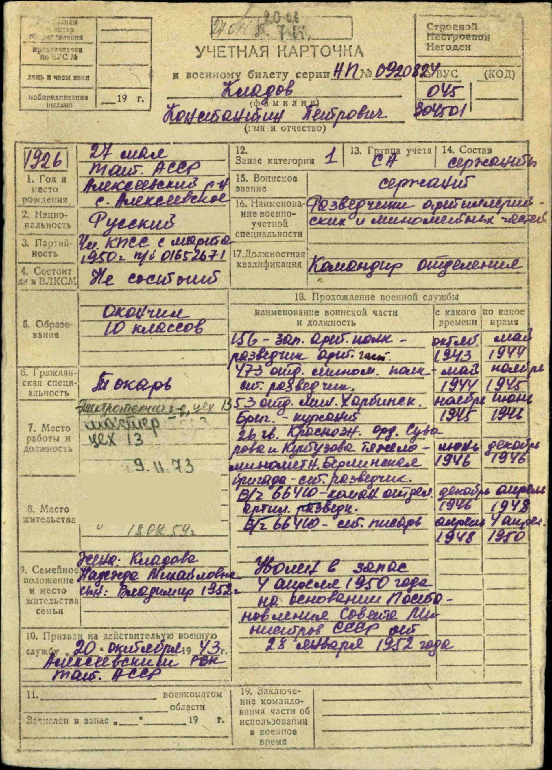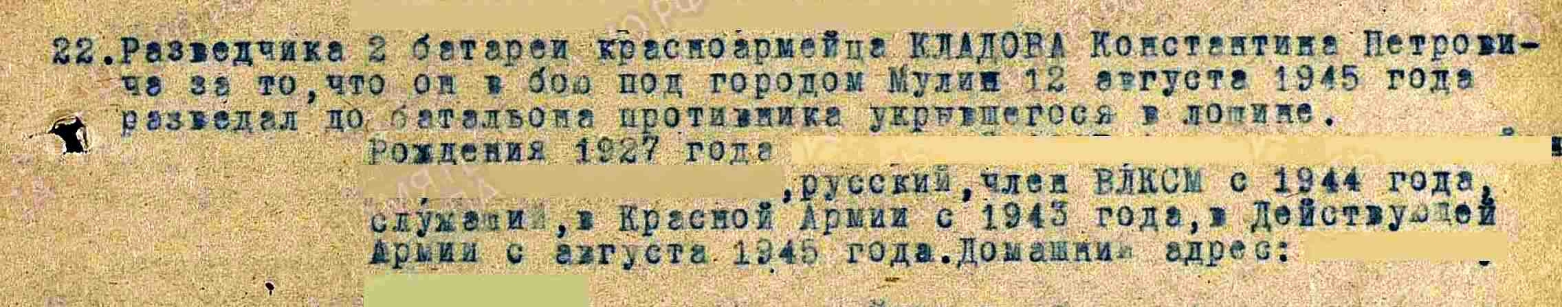 КЛАДОВ Константин Петрович, 1926, с. Алексеевское. Мобилизован 20 окт./ 10 нояб. 1943 Алексеевским РВК. Член ВЛКСМ. Красноармеец, разведчик 473 МинП 53 отд. МинБр 5 А 1 Дальневосточного фронта. Участник Советско-японской войны. Награждён медалями «За боевые заслуги», «За победу над Японией». Демобилизован 4 апр. 1950 в звании «мл. сержант».