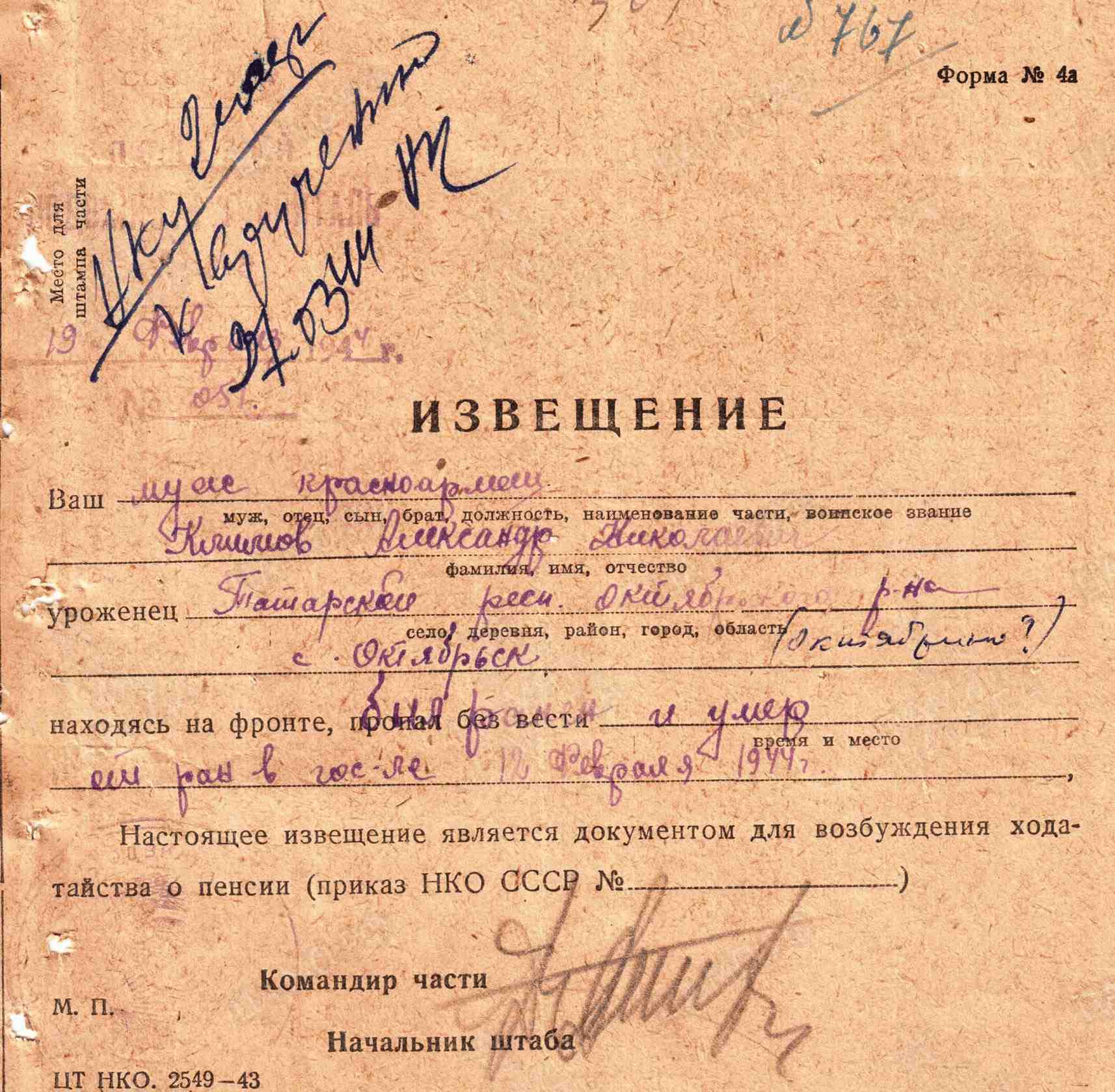 КЛИМОВ Александр Николаевич, 1904, с. Билярск. Мобилизован Октябрьским РВК ТАССР (г. Нурлат). Красноармеец. В 1944 – стрелок 1084 СП 310 СД 59 А Волховского фронта. Умер от ран 12 фев. 1944 в ХППГ 815, д. Нехино, Батецкий р-н, Новгородская обл. Увековечен на братской могиле в д. Жестяная Горка.