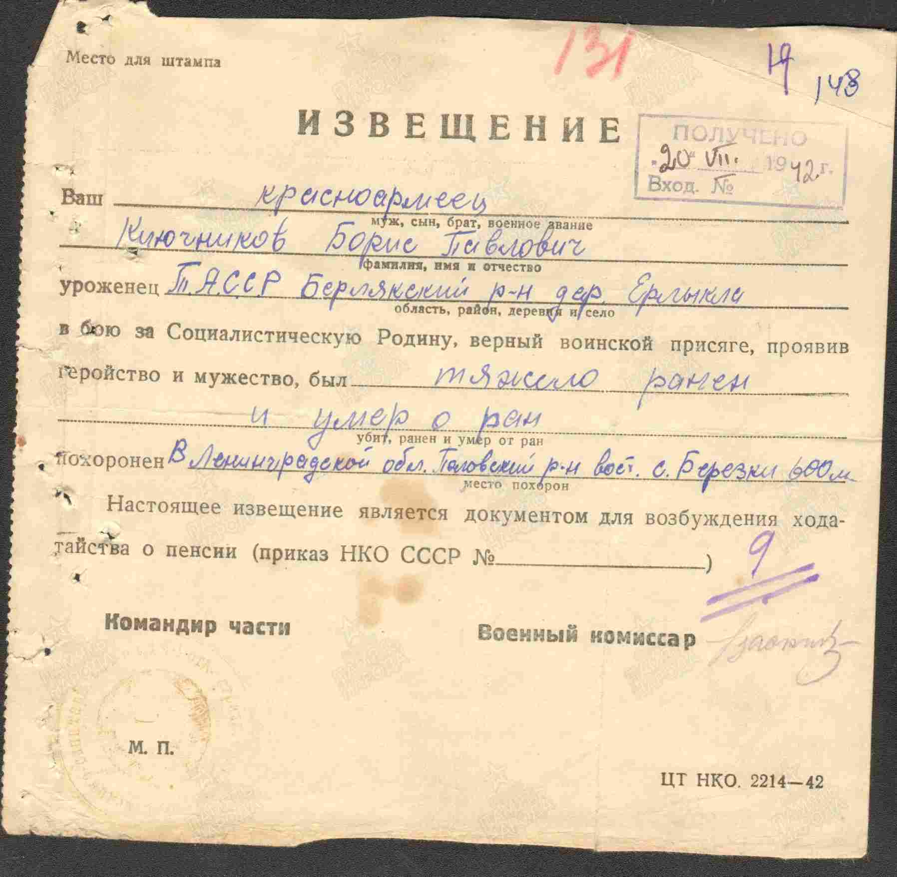 КЛЮЧНИКОВ Борис Павлович, 1911, д. Ерыкла. До призыва в армию работал пожарным на з-де № 340. Мобилизован Зеленодольским РВК 22 июня 1942. Красноармеец. Направлена на Северо-Западный фронт. Умер от ран в июле 1942, ппс 1789, медико-санитарная рота, д. Берёзка, Полавский (Парфинский) р-н, Новгородская обл.