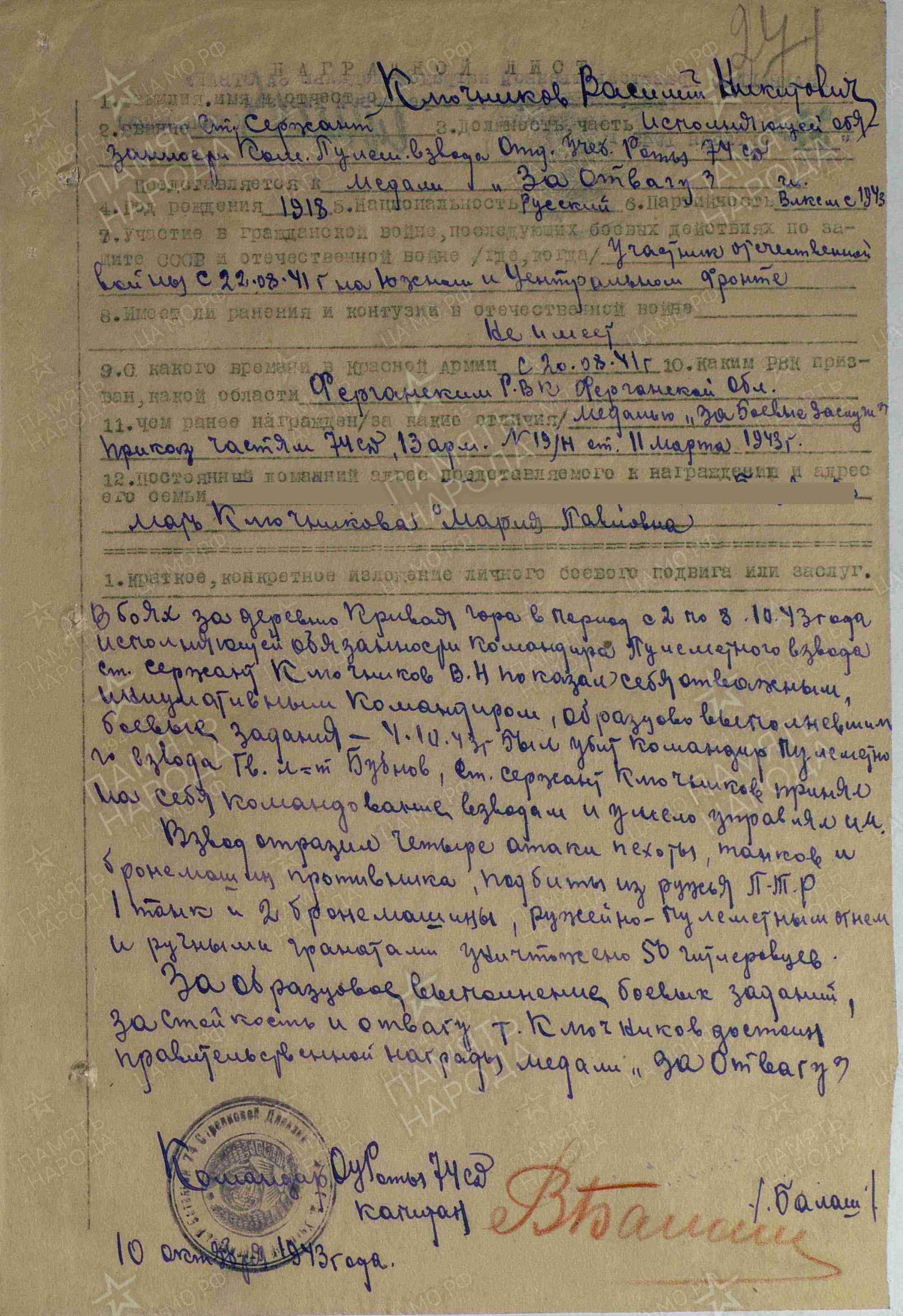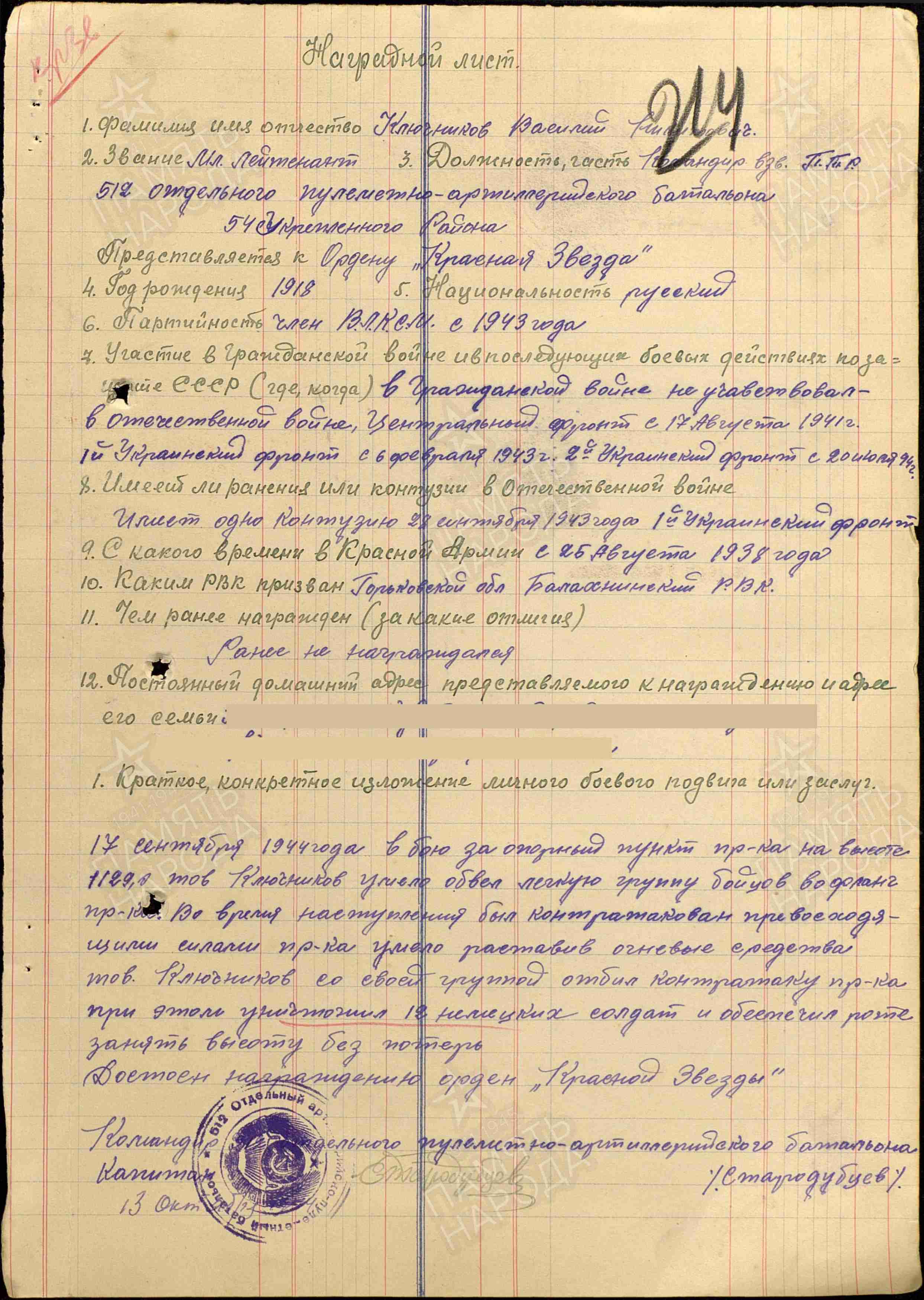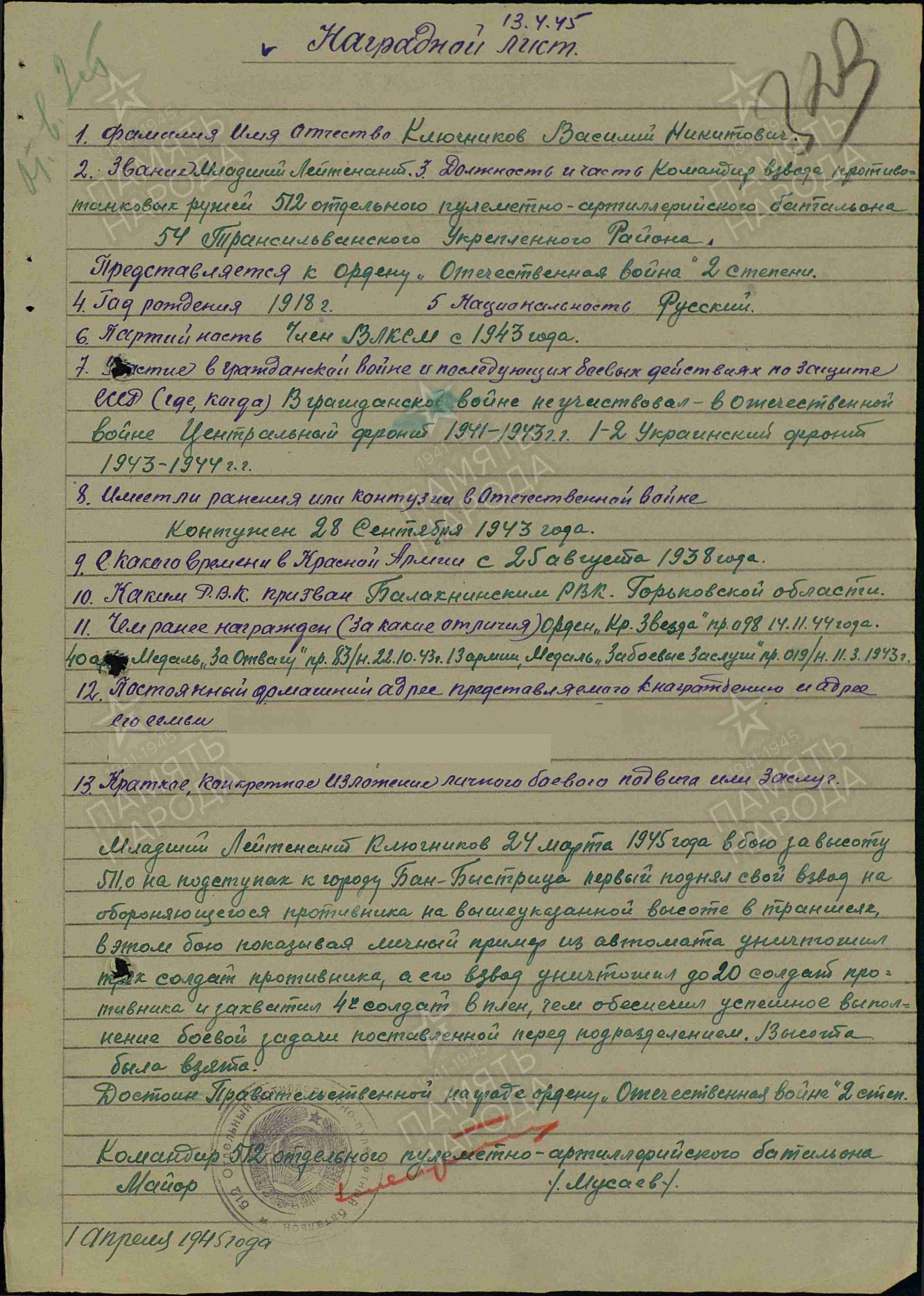 КЛЮЧНИКОВ Василий Никитович, 1918, с. Балахчино. Член ВЛКСМ. Мобилизован 25 авг. 1938 Балахнинским РВК Горьковской обл./ Ферганским РВК УзбССР. Воевал с авг. 1941 на Южном, Центральном, Брянском, Воронежском, 1 и 2 Украинском фронтах. В 1943 – курсант, ст. сержант, исп. обязанности ком. пулемётного взвода отд. учебной роты (батальона) 74 СД 8 СК 13 А. Контужен 28 сент. 1943. В 1944-1945 – мл. лейтенант/ лейтенант, ком. взвода ПТР 512 отд. ПулАБ 54 УР 27 А/ 53 А/ 40 А. Награждён медалями "За боевые заслуги", "За отвагу", орденами Красной Звезды, Отечественной войны 2 ст. (1945), Отечественной войны 1 ст. (1985). Уволен со службы 30 дек. 1945.