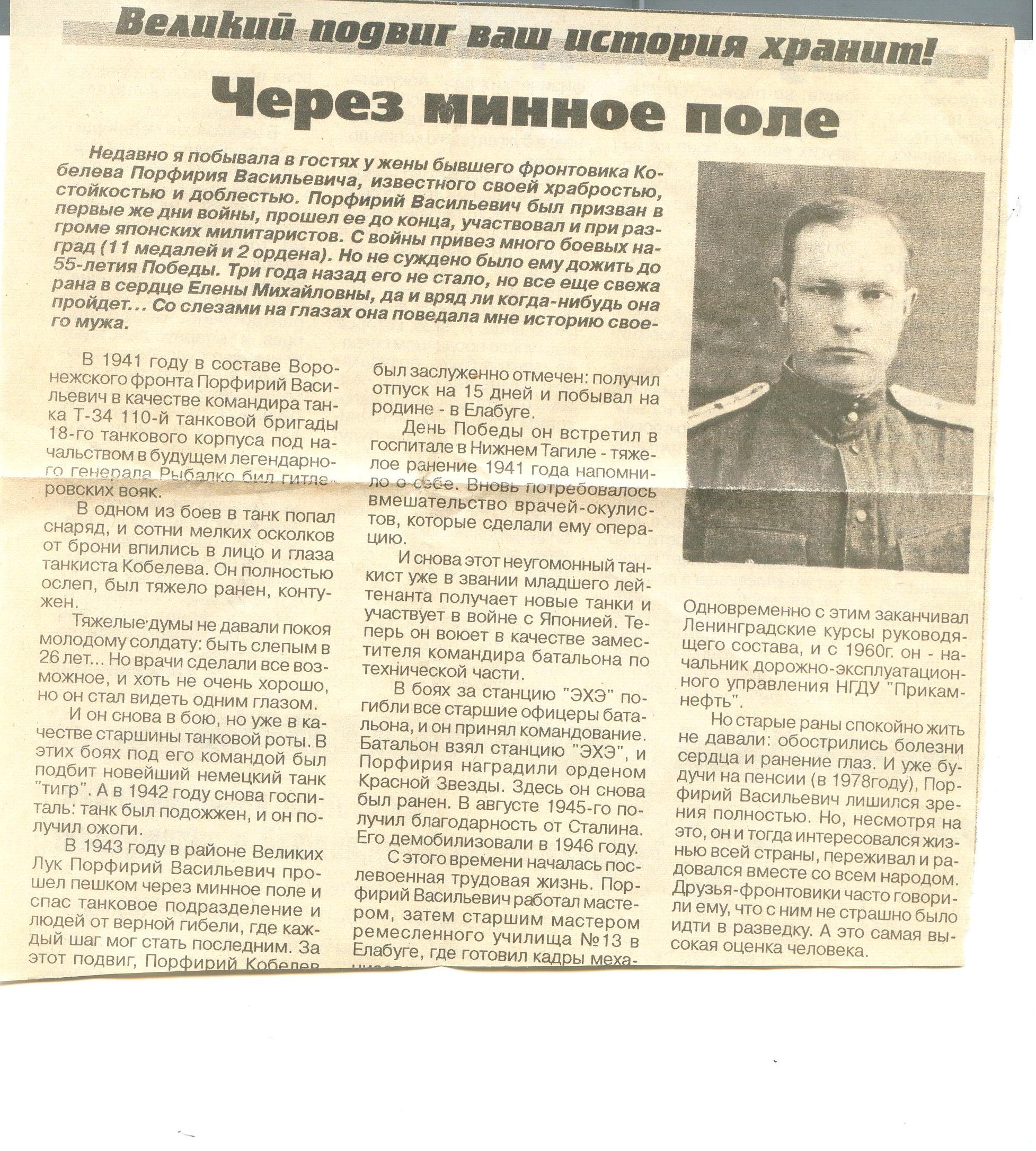 В 1943 году в районе Великих Лук Порфирий Васильевич прошел пешком через минное поле и спас танковое подразделение и людей от верной гибели, где каждый шаг мог стать последним. За этот подвиг. Порфирий Кобелев - был заслуженно отмечен: получил отпуск на 15 дней и побывал на родине - в Елабуге.