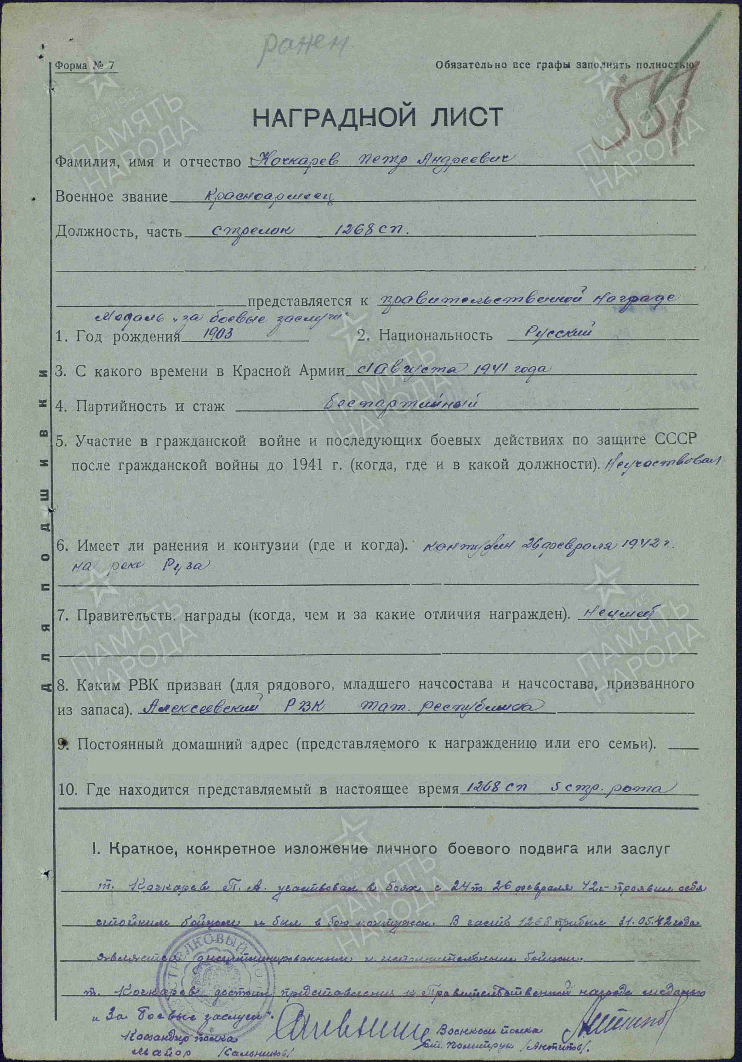 КОЧКАРЁВ Пётр Андреевич, 1903, уроженец Лаишевского уезда. Жил в д. Войкино. Мобилизован Алексеевским РВК 1 авг., по другим данным 1 окт., 1941. Воевал на Западном фронте в составе 10 А/ 20 А/ 33 А/ 31 А. Красноармеец, стрелок 210 СП 82 СД/ 1269 СП 385 СД. Участник обороны Москвы. Контужен в фев. 1942 на р. Руза, ранен в сент. 1942. Награждён медалью «За боевые заслуги». 9 янв. 1943 выбыл из ЭГ 2929, г. Орехово-Зуево, Московская обл., в 239 СД. Письменная связь с семьёй прекратилась 20 фев. 1943. Учтён пропавшим без вести.