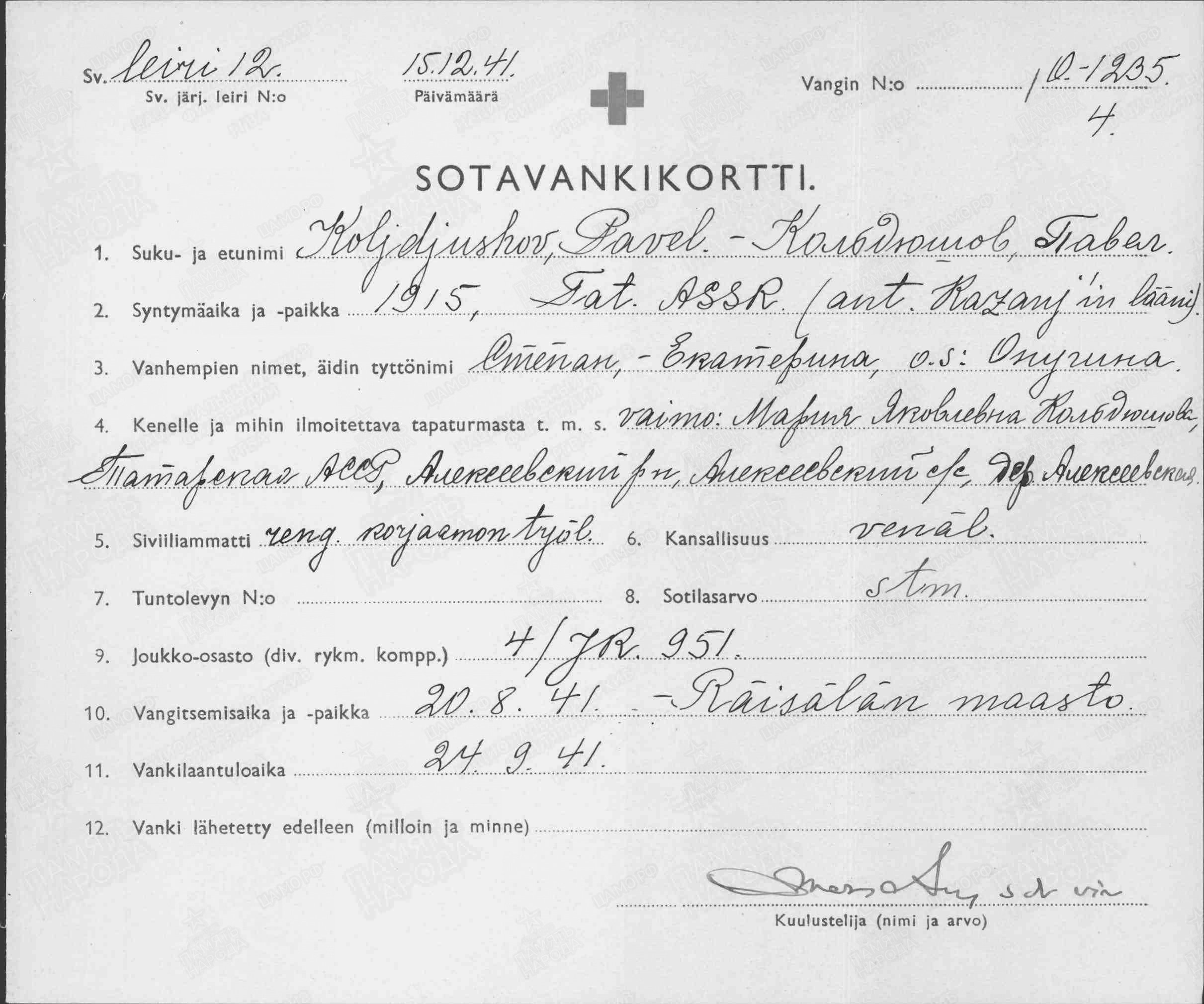 КОЛЬДЮШОВ Павел Степанович, 1915, с. Алексеевское. Мобилизован Алексеевским РВК 6 июля 1941. Красноармеец, стрелок 951 СП 265 СД 19 СК 23 А Ленинградского фронта. При обороне моста через р. Вуокси 20 авг. 1941 попал в плен в результате окружения. Содержался в финском лагере военнопленных № 12 Куркийоки, Ряйхеваара. После освобождения из плена несколько лет трудился на восстановлении разрушений в г. Ленинград. По возвращении на родину работал кочегаром в Алексеевсеом ПМК 435 и на кирпичном заводе. Скончался в 1985, похоронен в с. Алексеевское.