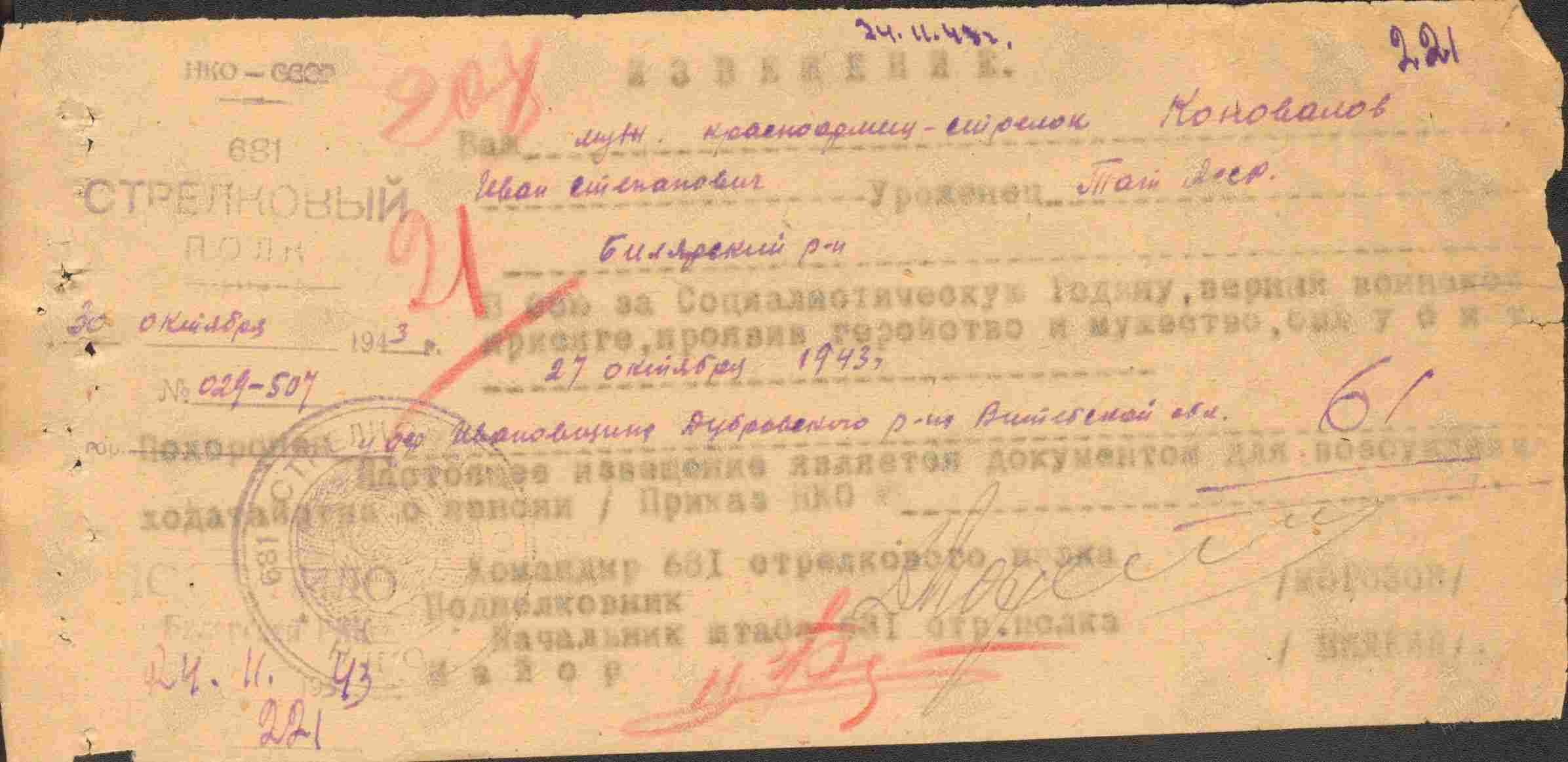КОНОВАЛОВ Иван Степанович, 1903, д. Лягушкино. Мобилизован 27 авг. 1941 Билярским РВК. Воевал на Калининском и Западном фронте в составе 31 А. Красноармеец, стрелок 1194 СП 359 СД/ 681 СП 133 СД. Ранен 21 янв. 1942. Погиб 27 окт. 1943, д. Ивановщина, Дубровненский р-н, Витебская обл., Белорусская ССР.