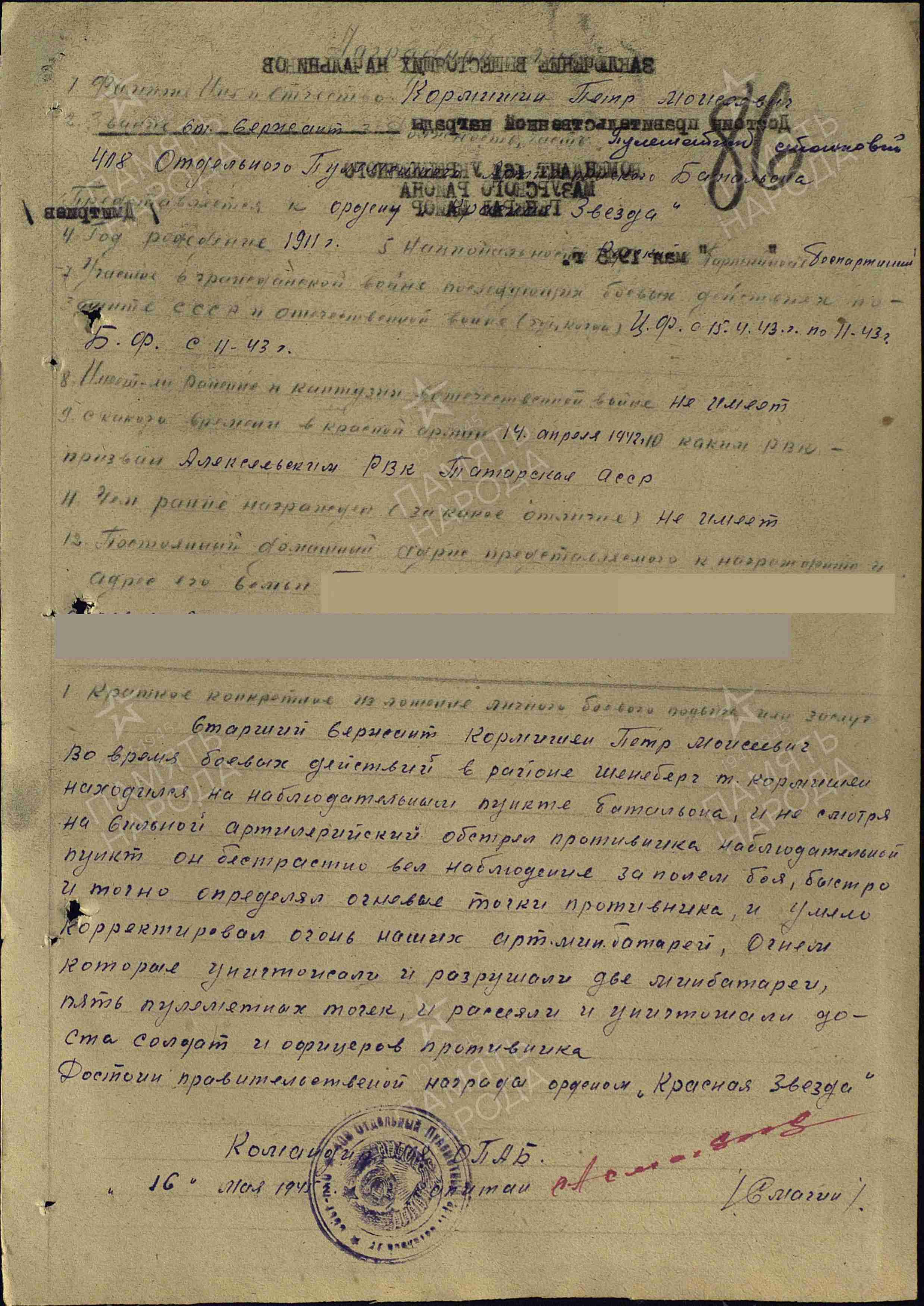 КОРМИШИН Пётр Моисеевич, 1911, с. Алексеевское. Мобилизован Алексеевским РВК 13 марта 1942. Воевал 15 апр. 1943 на Центральном, Белорусском, 2 и 3 Белорусском фронтах. В 1945 – ст. сержант, станковый пулемётчик, корректировщик-наблюдатель 408 отд. пулемётно-артиллерийского батальона 54 СК 43 А. Награждён орденами Красной Звезды, Отечественной войны 2 ст. (1985).