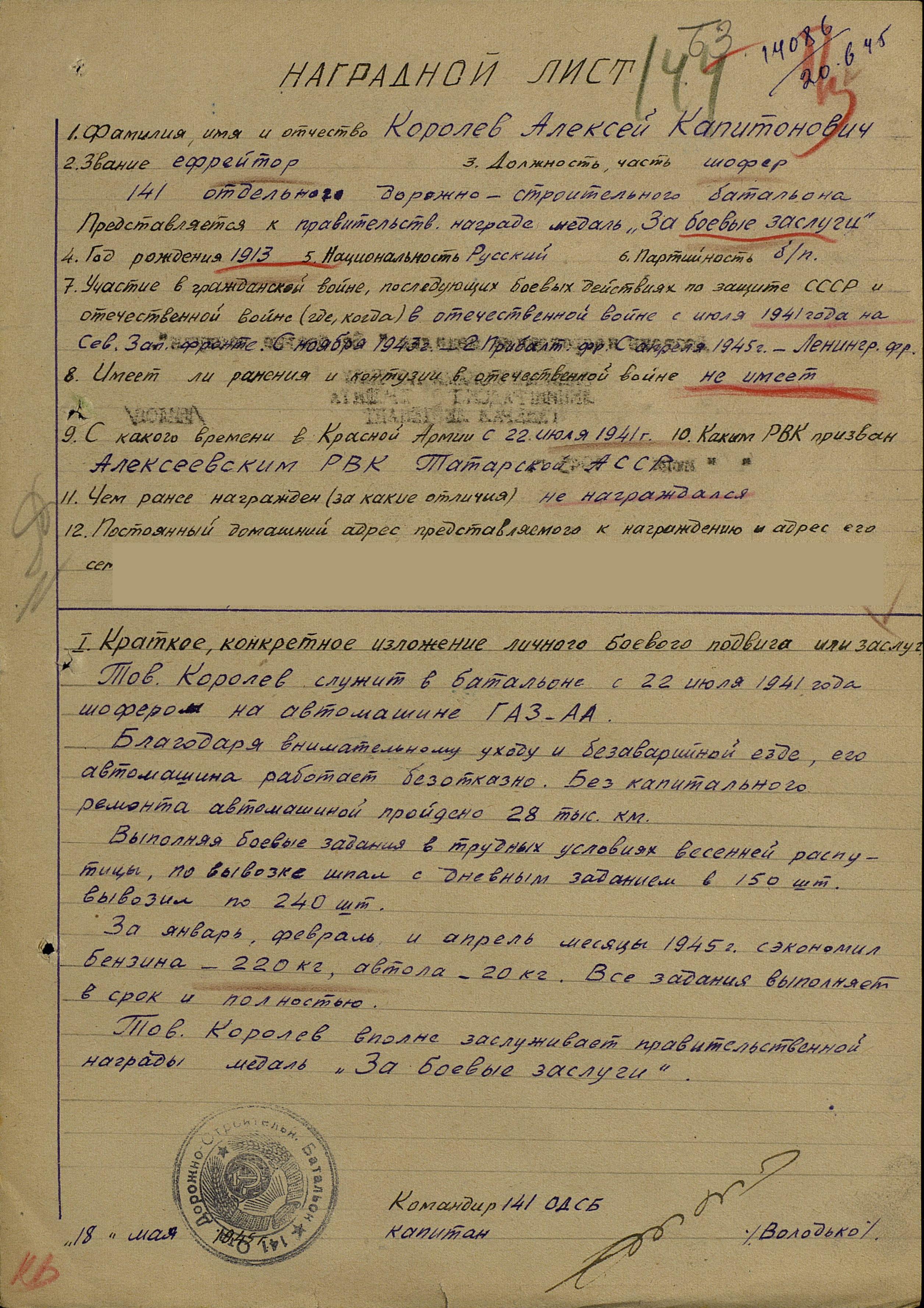 КОРОЛЁВ Алексей Капитонович, 1913, с. Алексеевское. Мобилизован Алексеевским РВК 22 июля 1941. Воевал на Северо-Западном, 2 Прибалтийском, Ленинградском фронте. Ефрейтор, шофёр а/м Газ АА 141 отд. дорожно-строительного батальона. Машина прошла без кап. ремонта около 28 000 км., перевыполняя суточные нормы перевозки грузов. За три месяца 1945 экономия топлива составила 220 кг. Награждён медалью "За боевые заслуги". Демобилизован 14 дек. 1945.