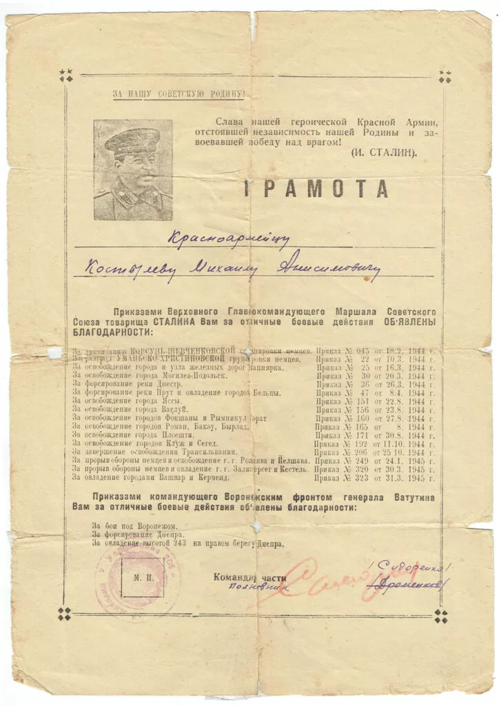 Тот бой был тяжелым. На следующий день немцы бросили против наших солдат танки. И из батальона, в котором служил Егор Костылев, из 700 человек осталось в живых 13. А он был тяжело ранен. И запомнил Егор Евдокимович, как тащили его на шинели, взявшись зубами за ее края, его боевые друзья. Они ползли, не выпуская шинель из зубов, а кругом гремели взрывы, и казалось, что сама земля стонала и содрогалась от них.