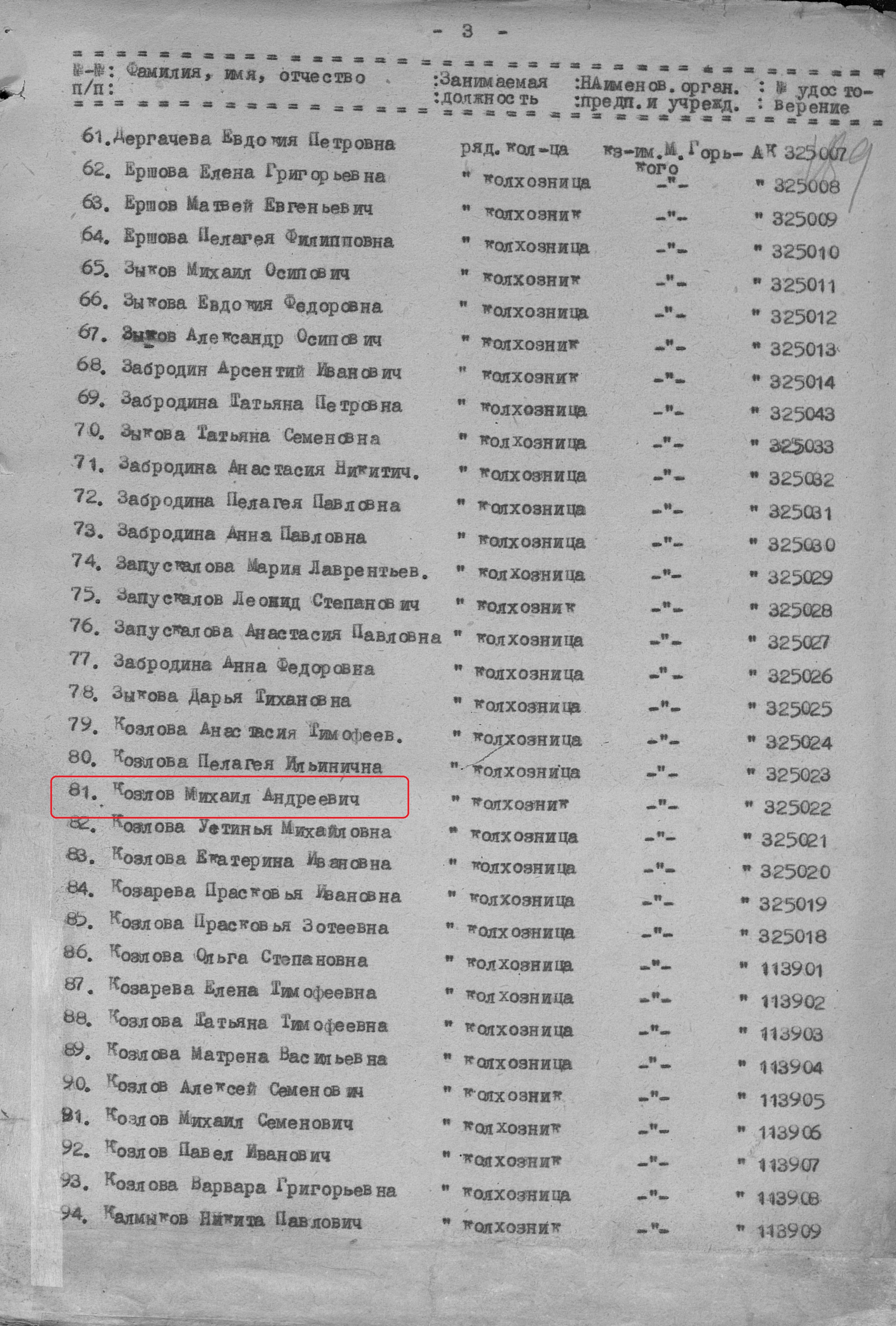 Козлов Михаил Андреевич родился в 1927 году. Место жительства: с.Сл.Арханегельская Ново-Шешминский район ТАССР. В годы Великой Отечественной войны работал в колхозе им. Горького рядовым колхозником. Награжден медалью "За доблестный труд в Великой Отечественной войне 1941–1945 гг." (Акт от 20 февраля 1946г., Фонд 3610, опись 2, дело № 470, лист 188, №325022).