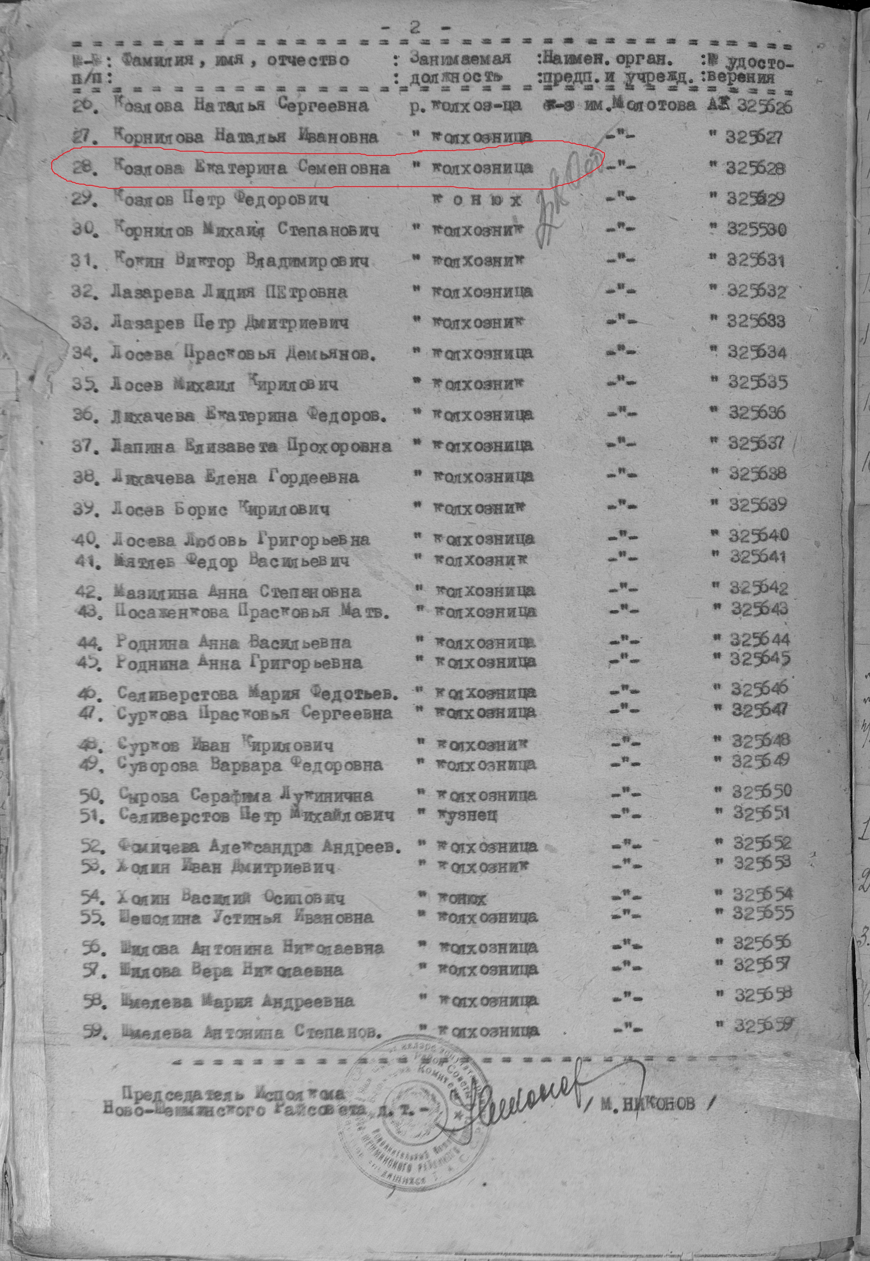 Козлова Екатерина Семеновна. Место жительства: с.Новошешминск. В годы войны работала в колхозе им.Молотова колхозницей. Награждена медалью "За доблестный труд в Великой Отечественной войне 1941–1945 гг." (Акт от 03.1948г., фонд 3610, опись 2, дело № 470, лист 280, АК №32562).