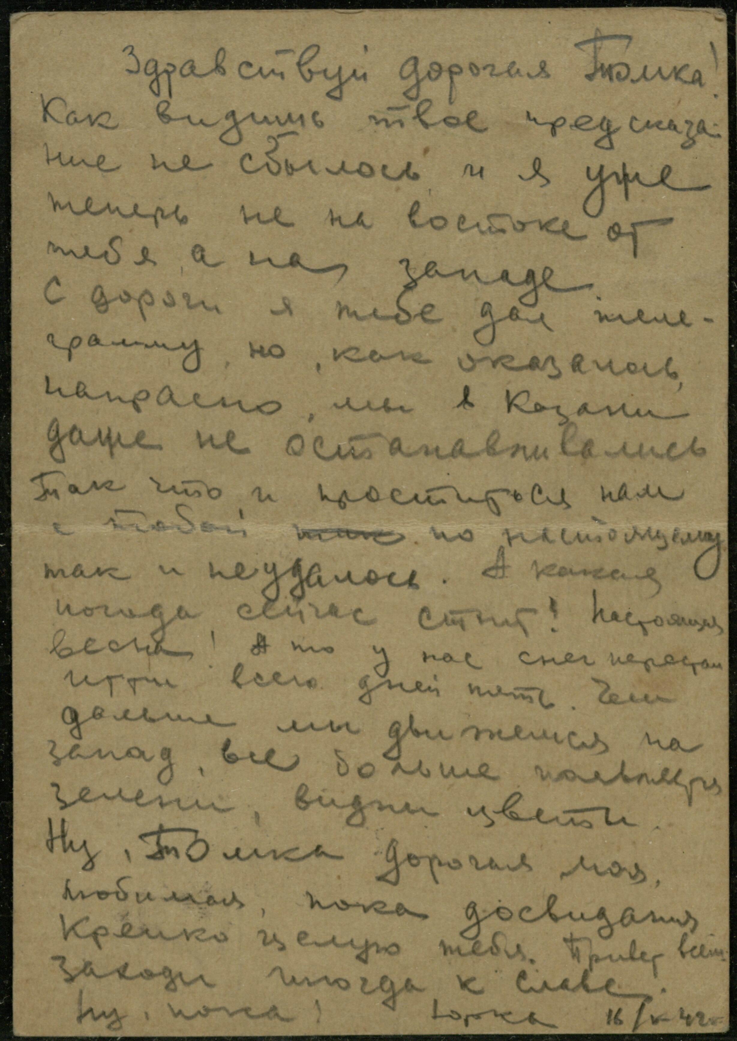 Ну, Томка, дорогая моя, любимая, пока до свидания. Крепко целую тебя. привет всем. Заходи иногда к Славе. Ну, пока. Юрка 16/V-42 г.