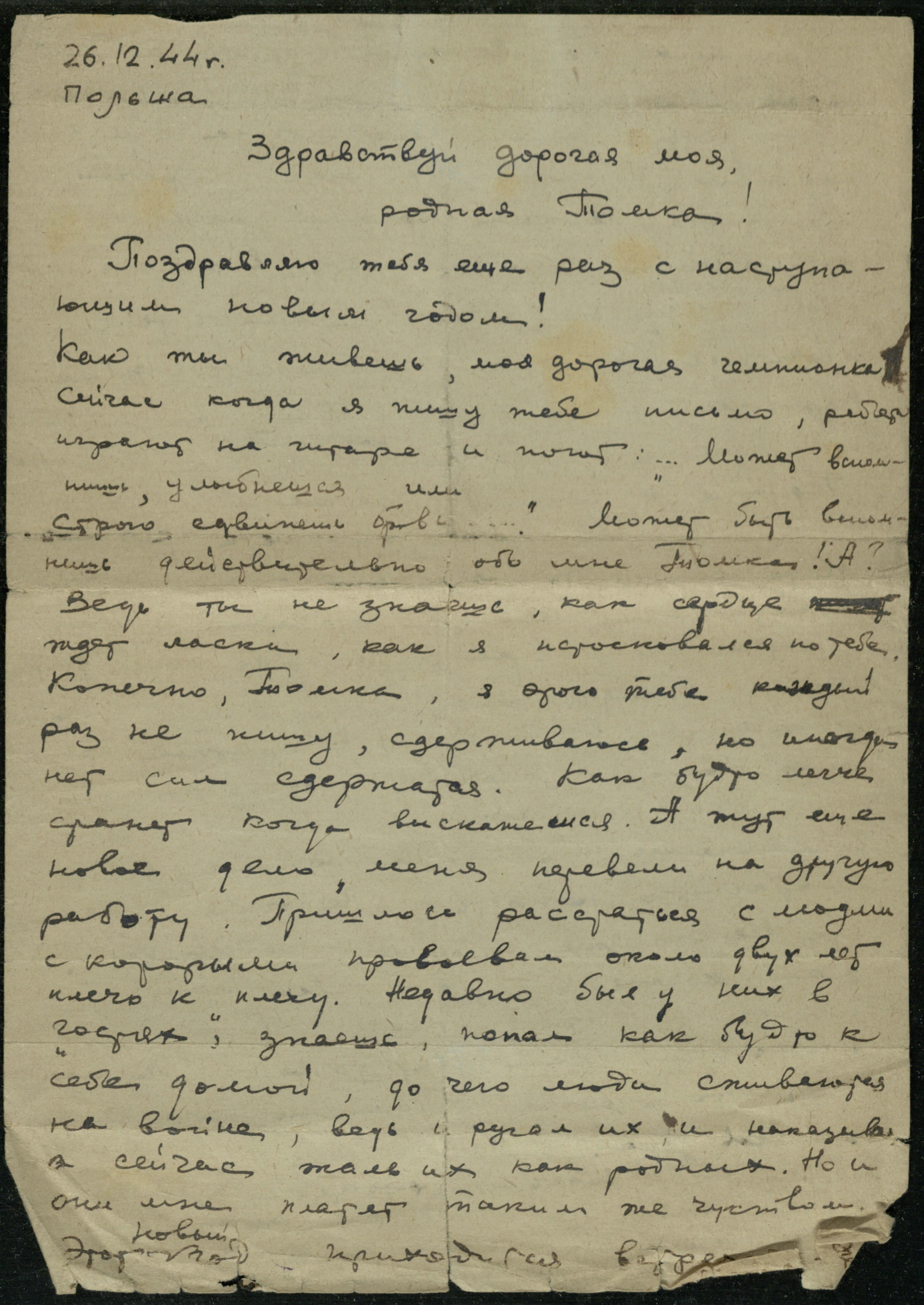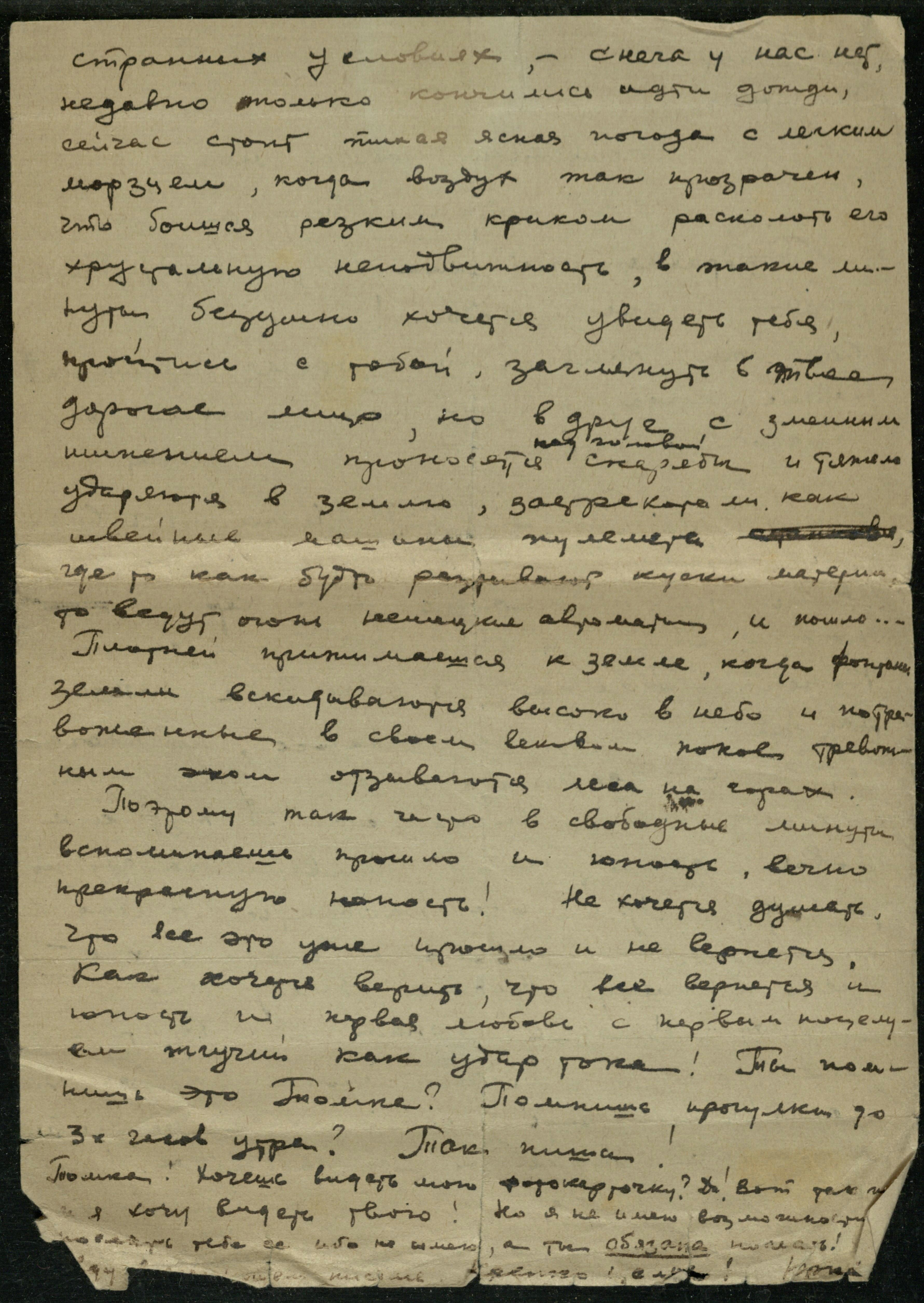 Как ты живешь, моя дорогая чемпионка? Сейчас, когда я пишу тебе письмо, ребята играют на гитаре и поют: «…Может вспомнишь, улыбнешься или строго сдвинешь брови…» Может быть вспомнишь действительно обо мне Томка! А? Ведь ты не знаешь, как сердце ждет ласки, как я натосковался по тебе. Конечно, Томка, я этого тебе каждый раз не пишу, сдерживаюсь, но иногда нет сил сдержаться. Как будто легче станет, когда выскажешься. А тут еще новое дело, меня перевели на другую работу. Пришлось расстаться с людьми, с которыми провоевал около двух лет плечо к плечу. Недавно был у них в «гостях», знаешь, попал как будто к себе домой, до чего люди сживаются на войне, ведь и ругал их и наказывал, а сейчас жаль их как родных. Но и они мне платят таким же чувством. Этот новый год приходится встречать в странных условиях, - снега у нас нет, недавно только кончились идти дожди, сейчас стоит тихая ясная погода с легким морозцем, когда воздух так прозрачен, что боишься резким криком расколоть его хрустальную неподвижность, в такие минуты безумно хочется увидеть тебя, пройтись с тобой, заглянуть в твое дорогое лицо, но вдруг с змеиным шипением проносятся над головой снаряды и тяжело ударяются в землю, застрекотали как швейные машины пулеметы, где-то как будто разрывают куски материи, то ведут огонь немецкие автоматчики, и пошло … Плотней прижимаешься к земле, когда фонтаны земли вскидываются высоко в небо и потревоженные в своем вековом покое тревожным эхом отзываются леса на горах.