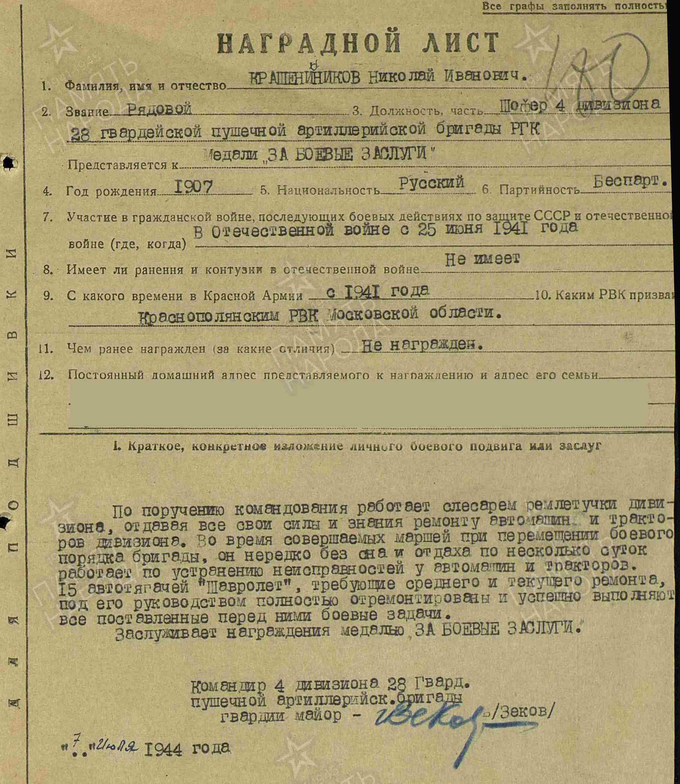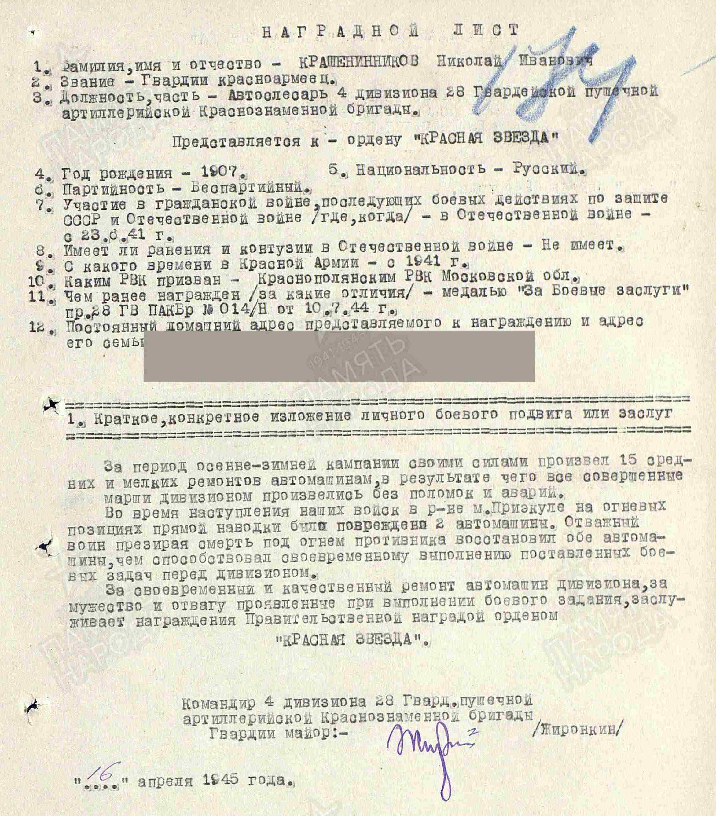 КРАШЕНИННИКОВ Николай Иванович, 1907, с. Новоспасск. Мобилизован Красно-Полянским РВК в 1941. Красноармеец. Воевал в артиллерийских частях 22 А Северо-Западного фронта. Гв. красноармеец, шофёр, автослесарь ремотной подвижной мастерской 28 гв. ПАБр 8 ПАД РГК 43 А/ 39 А/ 11 гв. А/ 4 УдА/ 51 А/ 61 А 1 Прибалтийского фронта, 51 А 2 Прибалтийского фронта/ Курляндской группы войск Ленинградского фронта. Награждён медалью «За боевые заслуги», орденом Красной Звезды.