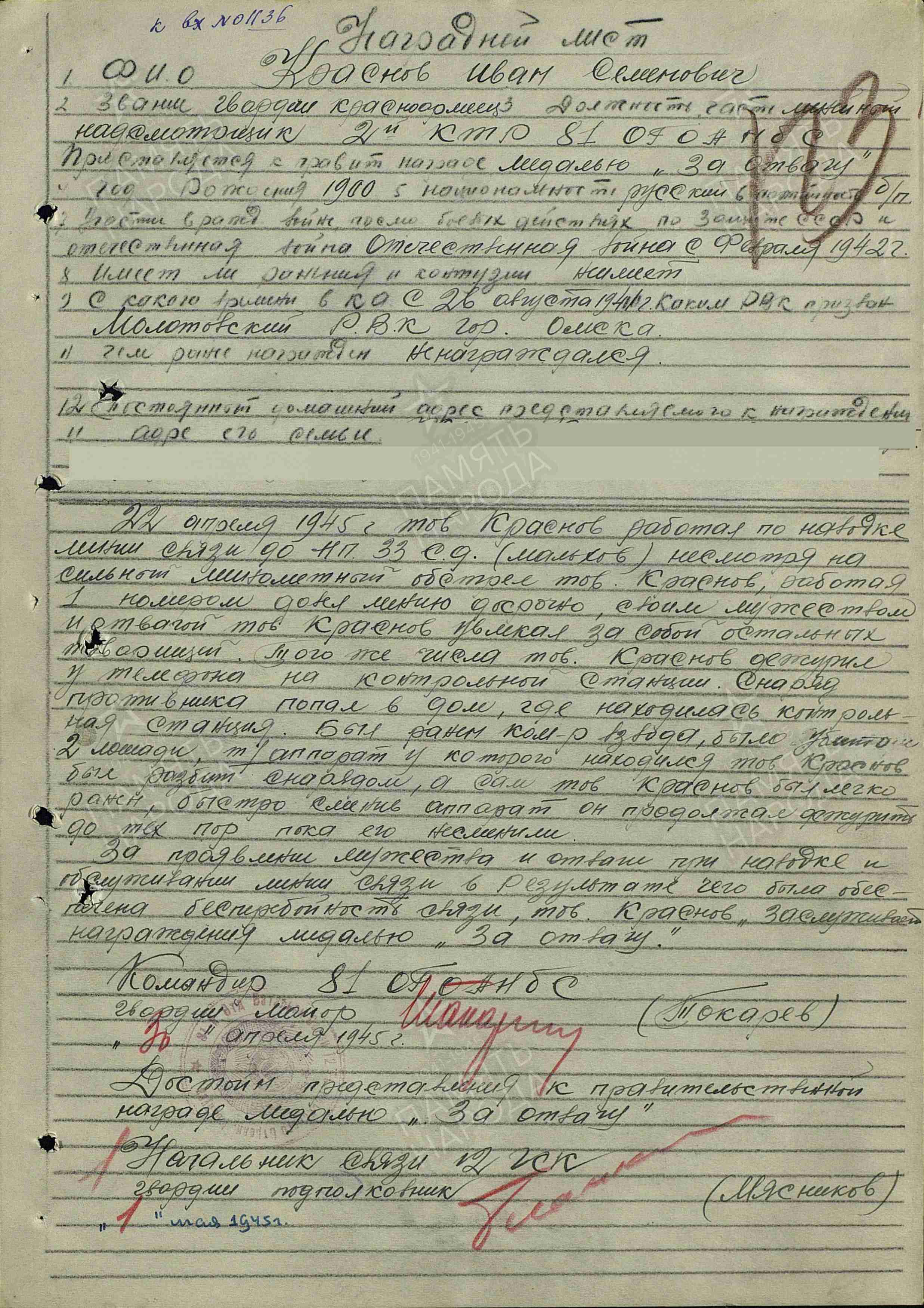 КРАСНОВ Иван Семёнович, 1900, с. Русская Мараса. Мобилизован 26 авг. 1941 Молотовским РВК г. Казань. С фев. 1942 воевал на Северо-Западном, 2 Прибалтийском, 3 Прибалтийском, 1 Белорусском фронте в составе 11 А/ 27 А/ 1 УдА/ 6 гв. А/ 3 УдА. Участник освобождения Прибалтики, Польши, боёв в Германии. Легко ранен 22 апр. 1945. Гв. красноармеец, линейный надсмотрщик кабельно-телефонной роты 81 отд. гв. батальона связи 12 гв. СК. Награждён медалью «За отвагу». Демобилизован 22 авг. 1945.